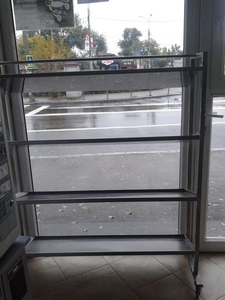 Rastel prezentare inox, 4 rafturi, 120 cm latime, roti, instalatie iluminare, aproape nou - 300 lei