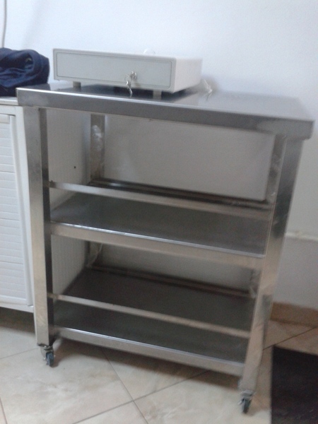 Masa inox pentru casa de marcat cu 2 polite si roti, aproape noua - 300 lei