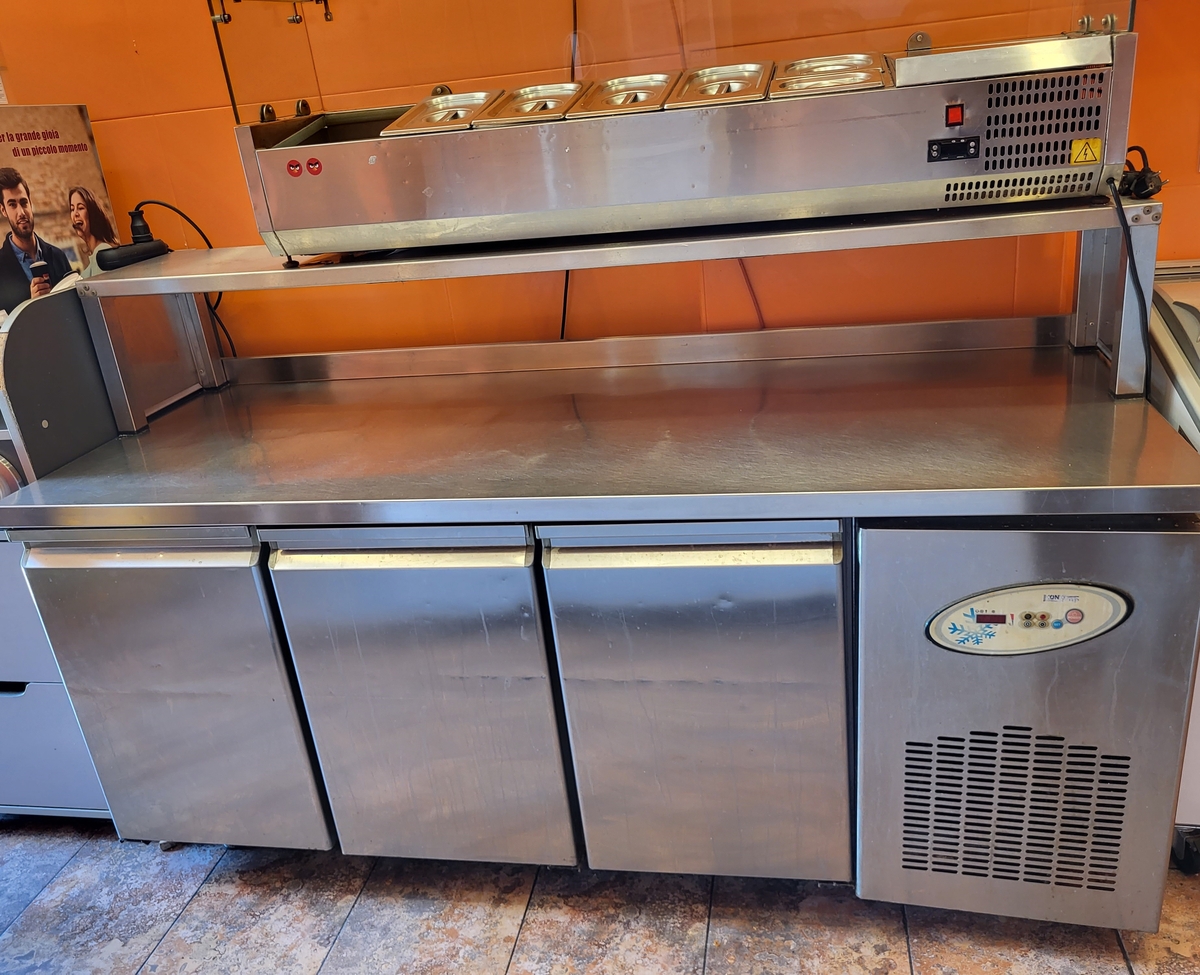 Masa preparare pizza cu 3 usi, refrigerata, blat inox, afisaj digital al temperaturii, 190 x 70 x 85 cm, alimentare 220V – Pret: 1000 euro.