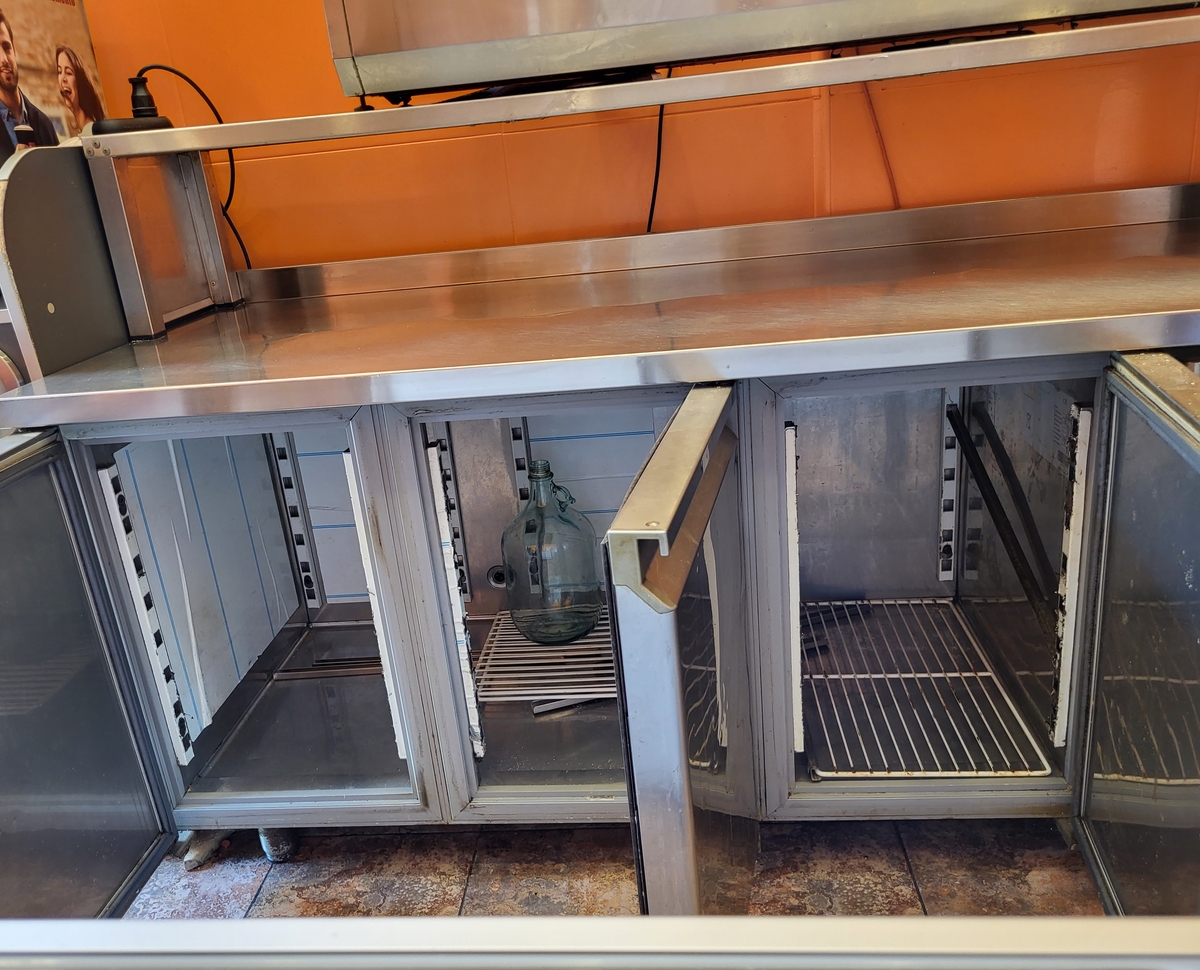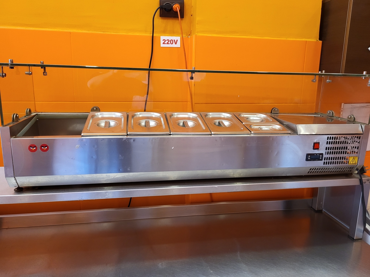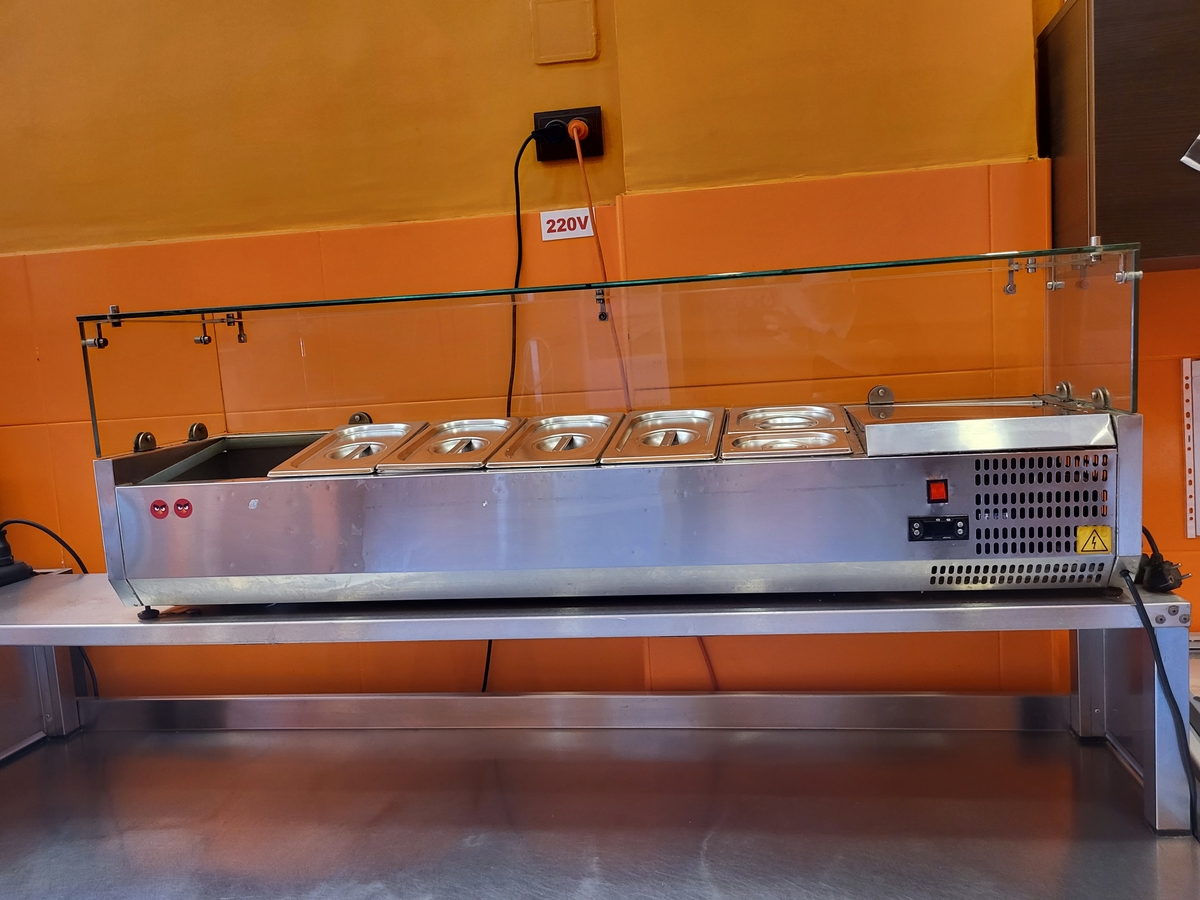 Vitrina frigorifica pt ingrediente pizza, afisaj digital al temperaturii, 140 x 40 x 45 cm, alimentare 220 V. Pret: 300 euro.