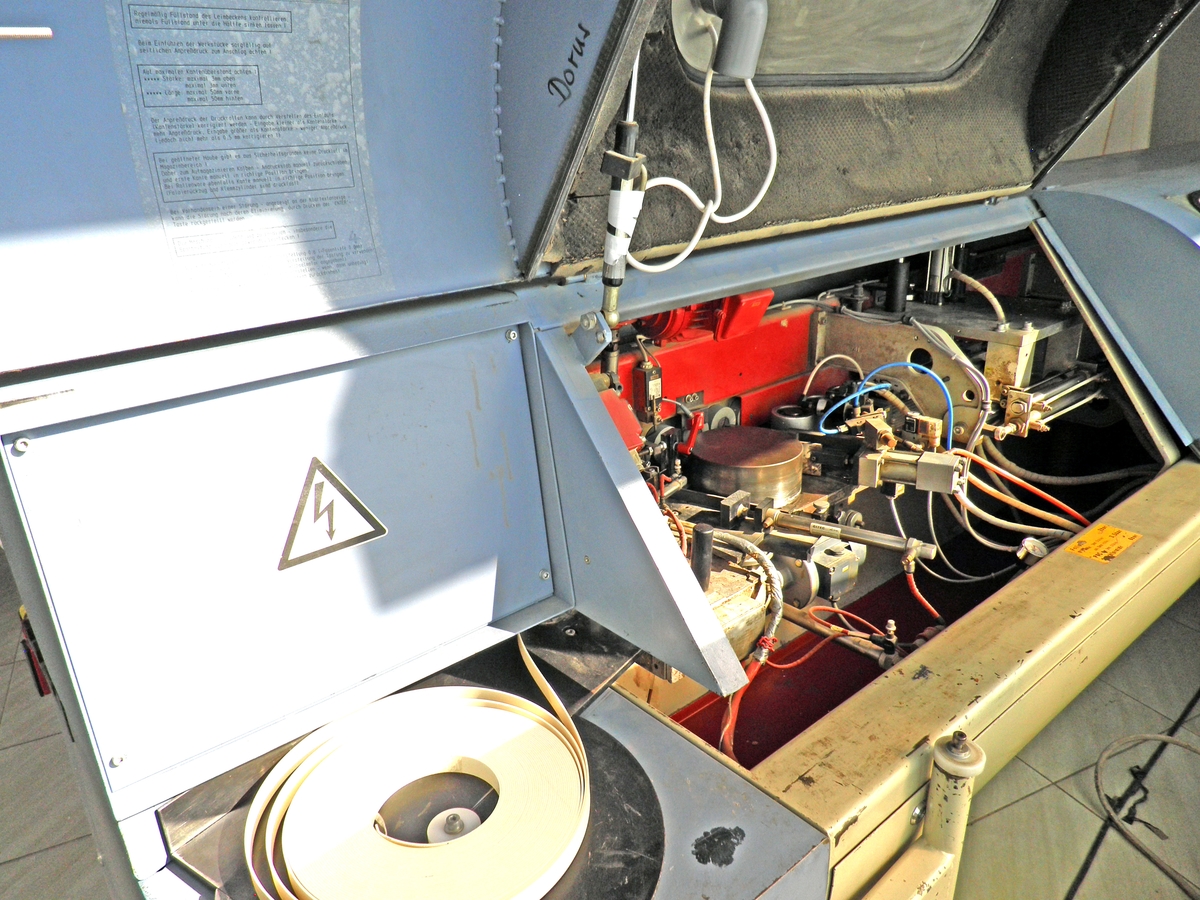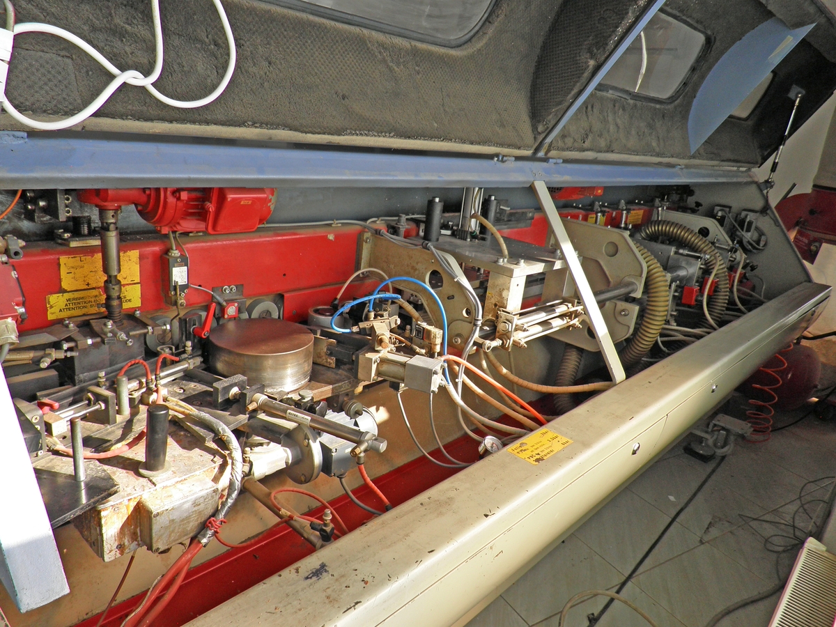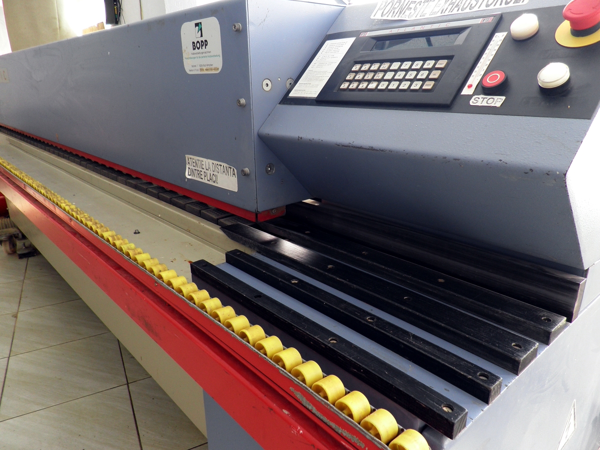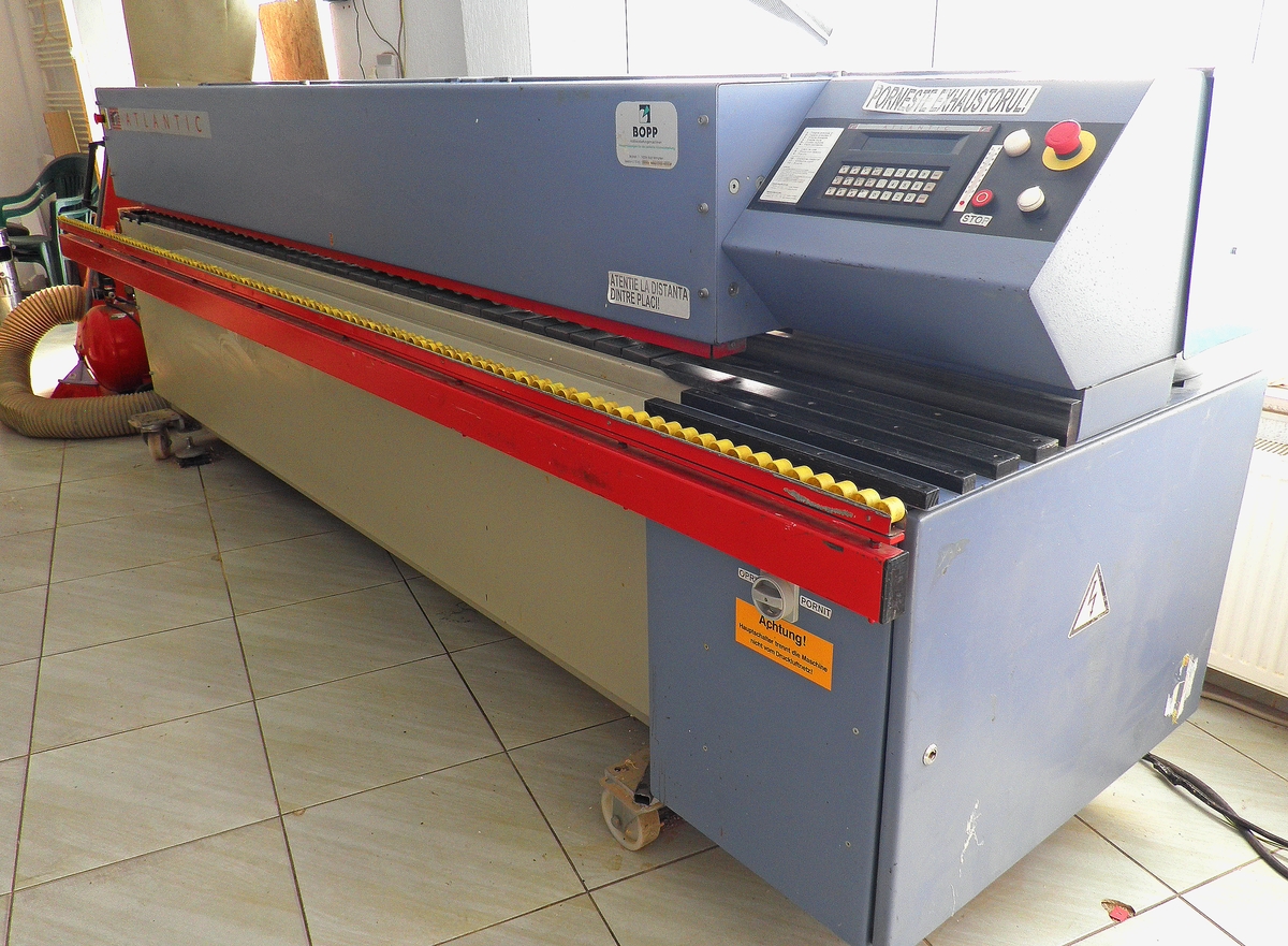 Masina aplicat cant automata, control numeric, avans automat, frezare pe drept si raza 2 mm, Agregat razuire surplus adeziv, perii lustruire. In stare foarte buna, solida, 1330 kg, trifazata, 7.6KW.
