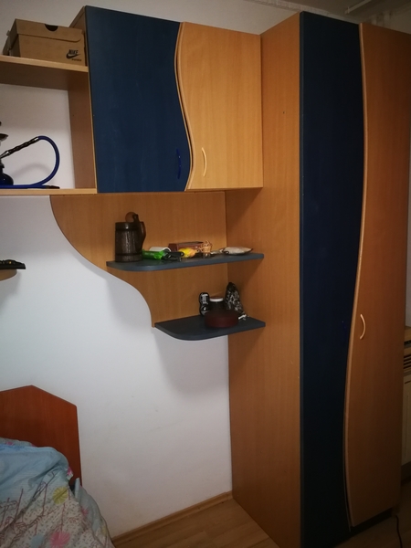 Vand mobila pentru camera tineret sau dormitor. Culoare albastru/crem. Mobila se afla in stare buna, are 1 corp inalt cu rafturi, 1 corp sifonier cu rafturi si bara de umerase.