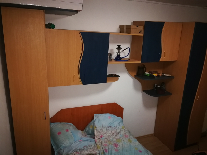 Mobila pentru dormitor. In locul patului se poate pune birou. Patul poate fi montat si la perete, nu ca in poza astfel castigand spatiu in camera.