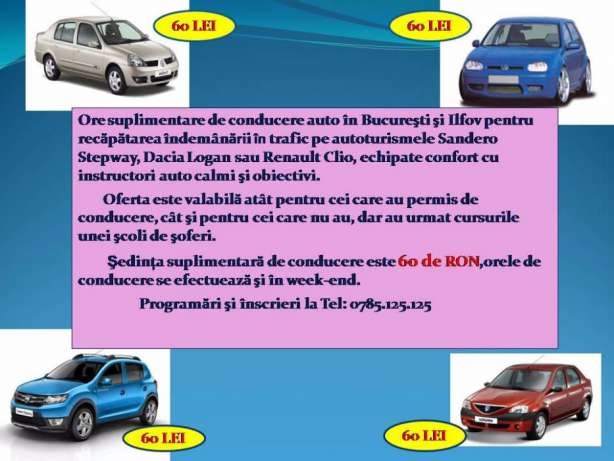 Bucuresti si Ilfov pentru recapatarea indemanarii in trafic pe autoturismele Sandero Stepway, Dacia Logan sau Renault Clio, echipate confort cu instructori auto,