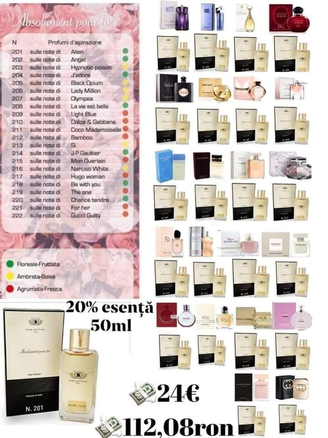 112.08 Ron/ 24 Euro oricare parfum din imagini. Livrarea in 2-4 zile prin curier DHL, in Romania si in tarile din Uniunea Europeana. Pentru comenzi scrieti la officemysnep@gmail.com. Spune numele parfumului preferat si te ajut sa gasesti corespondentul, la un pret super accesibil!