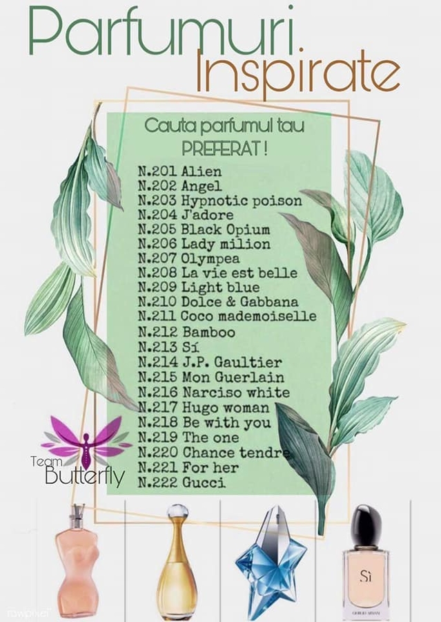 Vand parfumuri inspirate din cele mai cunoscute brand-uri: Si, Black Opium, J'adore, La vie est belle, Aventus, Invictus, One Million, J.P Gaultier, Sauvage, D&G, Kenzo, Bulgari, Aqua di Giò si multe altele.