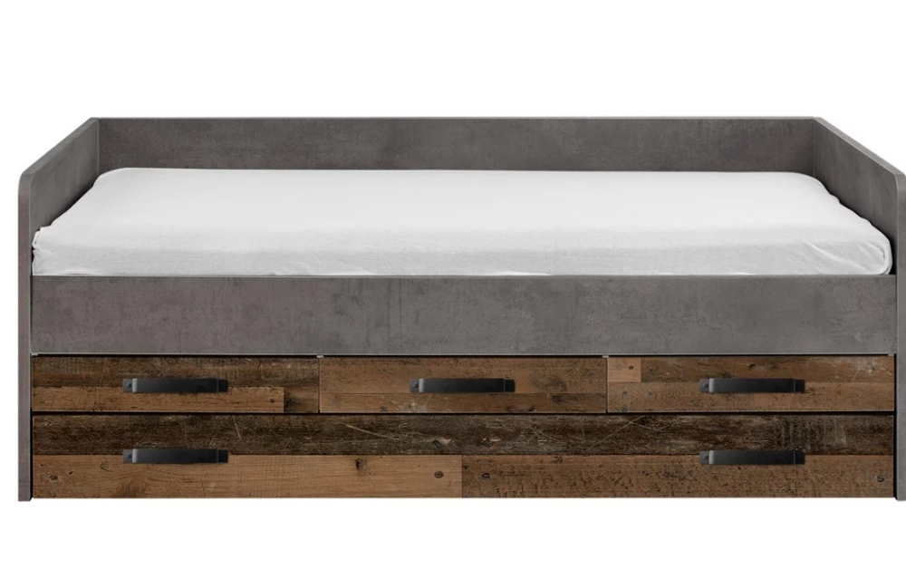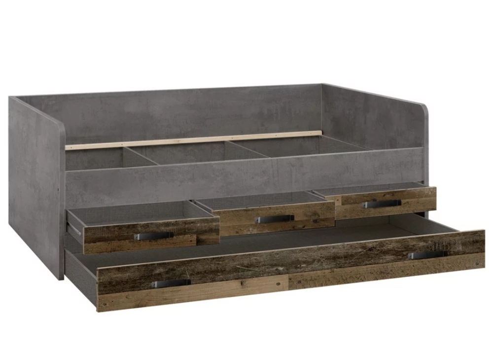 Are 3 sertare medii si un sertar mare, care poate fi folosit ca spatiu de depozitare sau pusa o saltea suplimentara, 90x200.