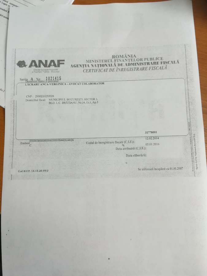 declar pierdut Certificat de inregistrare fiscala seria A nr. 1021415 eliberat la 05.01.2016 de Agentia Nationala de Administrare Fiscala pentru Lacraru Anca Verginica, avocat colaborator, CIF32778001