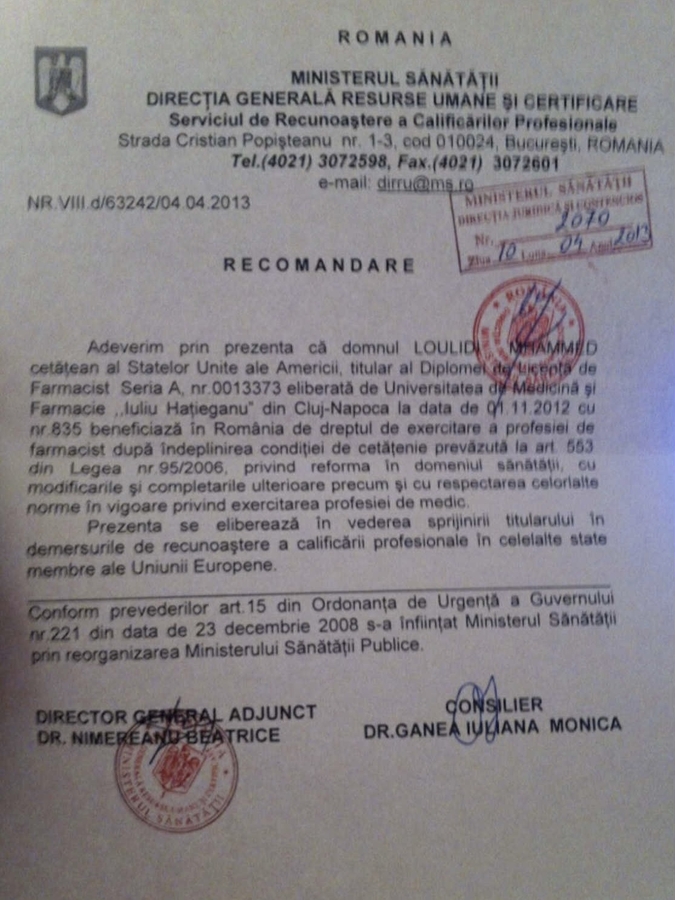 Pierdut recomandare eliberata de catre MINISTERUL SANATATII DIRECTIA GENERALÁ RESURSE UMANE SI CERTIFICARE Serviciul de Recunoastere a Calificárilor Profesionale NR.VIII.d/63242/04.04.2013