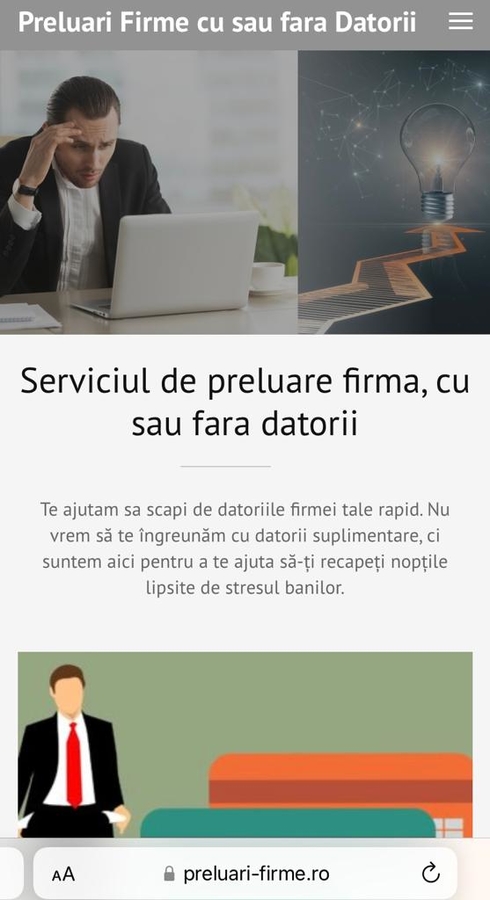 Preluam firme cu datorii mici, medii si mari la Anaf, furnizori, angajati. Lucram in toata Romania. Experienta peste 20 de ani in domeniu. Ne asumam si reprezentarea la eventualele controale ale institutiilor statului. Www.preluari.ro Sigur, rapid, legal si eficient.