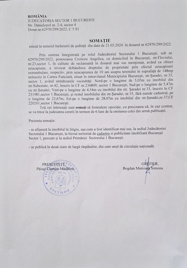 Romania, Judecatoria Sector 1 Bucuresti, str. Danielopol, nr. 2-4, sector 4. Dosar nr. 62970/299/2022, C 5 S1. Somatie emisa in temeiul incheierii de sedinta din data de 21.05.2024 in dosarul nr 62970/299/2022. Prin cererea inregistrata pe rolul Judecatoriei Sectorului 1 Bucuresti, sub nr. 62970/299/2022, posesoarea Croitoru Angelica, cu domiciliul in Bucuresti, Str. Fluviului, nr. 23, sector 1, in calitate de reclamanta, in dosarul mai sus mentionat, avand ca obiect uzucapiune, a invocat dobandirea dreptului de proprietate prin efectul uzucapiunii extratabulare, respectiv, prin uzucapiunea de 10 ani asupra terenului in suprafata de 148 mp neinscris in Cartea Funciara, situat in intravilanul Municipiului Bucuresti, str. Saradei, nr. 35, sector 1, avand urmatoarele vecinatati: Nord-pe o lungime de 5,05 m cu imobilul din str. Subcetate, nr. 42, inscris in CF nr. 236809, sector 1, Bucuresti; Sud-pe o lungime de 5,47m cu str. Saradei; Vest-pe o lungime de 4,54 m cu imobilul din str. Saradei, nr. 33, inscris in CF 231981, sector 1, Bucuresti, si restul imobilunui din str. Saradei nr. 35, fara numar cadastral, pe o lungime de 23,67 m; Est-pe o lungime de 28,07 m cu imobilul din str. Saradei, nr. 37, CF220201, sector 1, Bucuresti. Toti cei interesati sunt somati sa formuleze opozitie, cu precizarea ca, in caz contrar, se va trece la judecarea cereriiin termen de 6 luni de la emitrerea celei din urma publicatii. Prezenta somatie: se afiseaza la imobilul in litigiu, asa cum a fost identificat mai sus, la sediul Judecatoriei Sectorului 1 Bucuresti, la biroul teritorial de cadastru si publicitate imobiliara Bucuresti Sector 1, precum si la sediul Primariei Sectorului 1 Bucuresti.