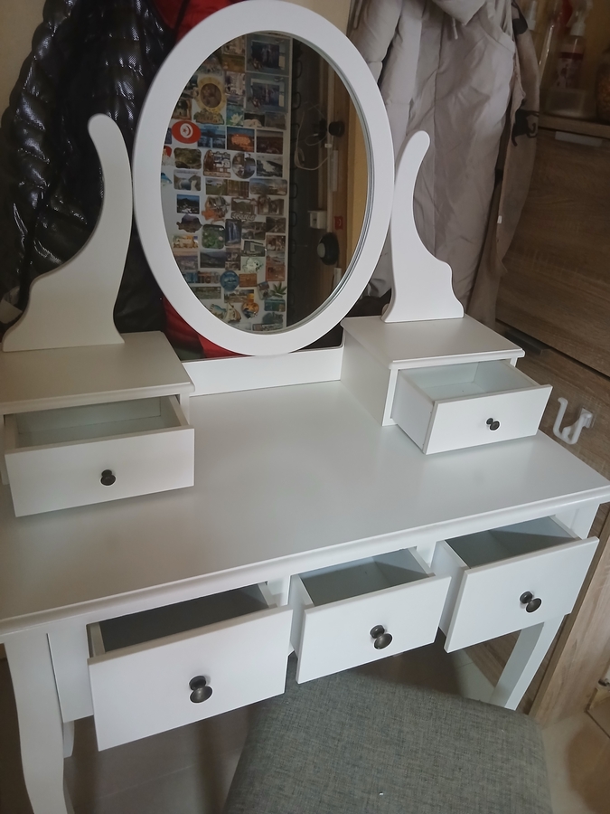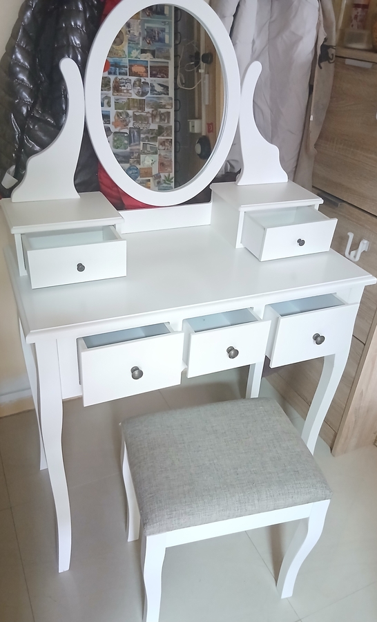 Vand masuta de make-up, cu oglinda ovala, alba, eleganta, stil modern, in stare foarte buna (aproape noua). Se poate integra foarte frumos in dormitor. Scaunul este tapitat si nu ocupa mult loc... se poate introduce sub masuta. Pozele sunt reale, iar pretul este negociabil. Nu prezinta urme de deteriorare (nu este zgariata sau lovita).