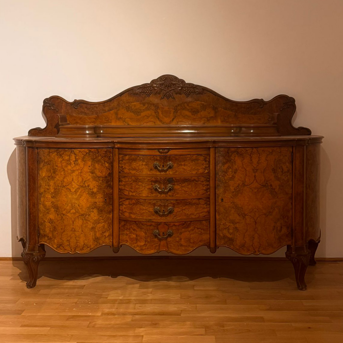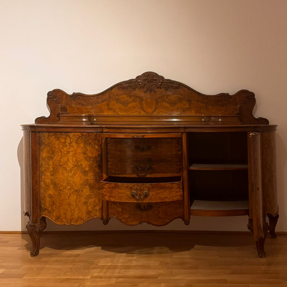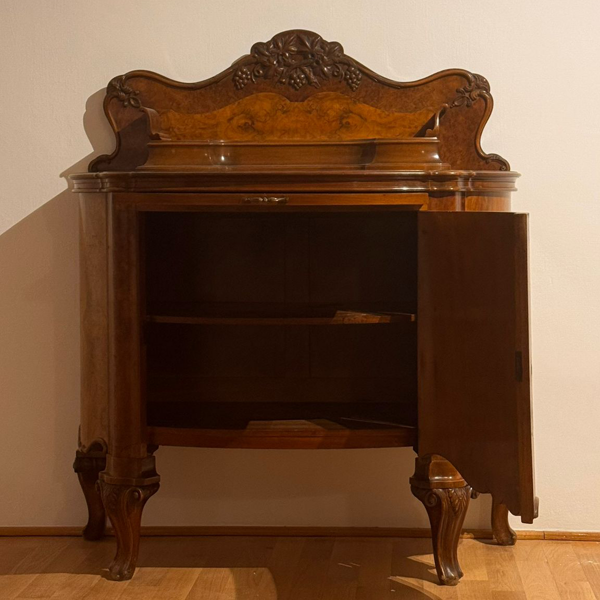 Vand set de mobilier stil Chippendale, realizat in perioada 1920–1935, cu furnir de nuc si decor floral viticol. Piesele sunt intr-o stare buna, cu componente originale.