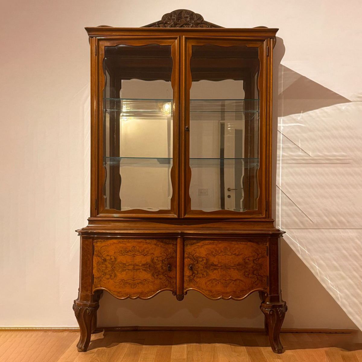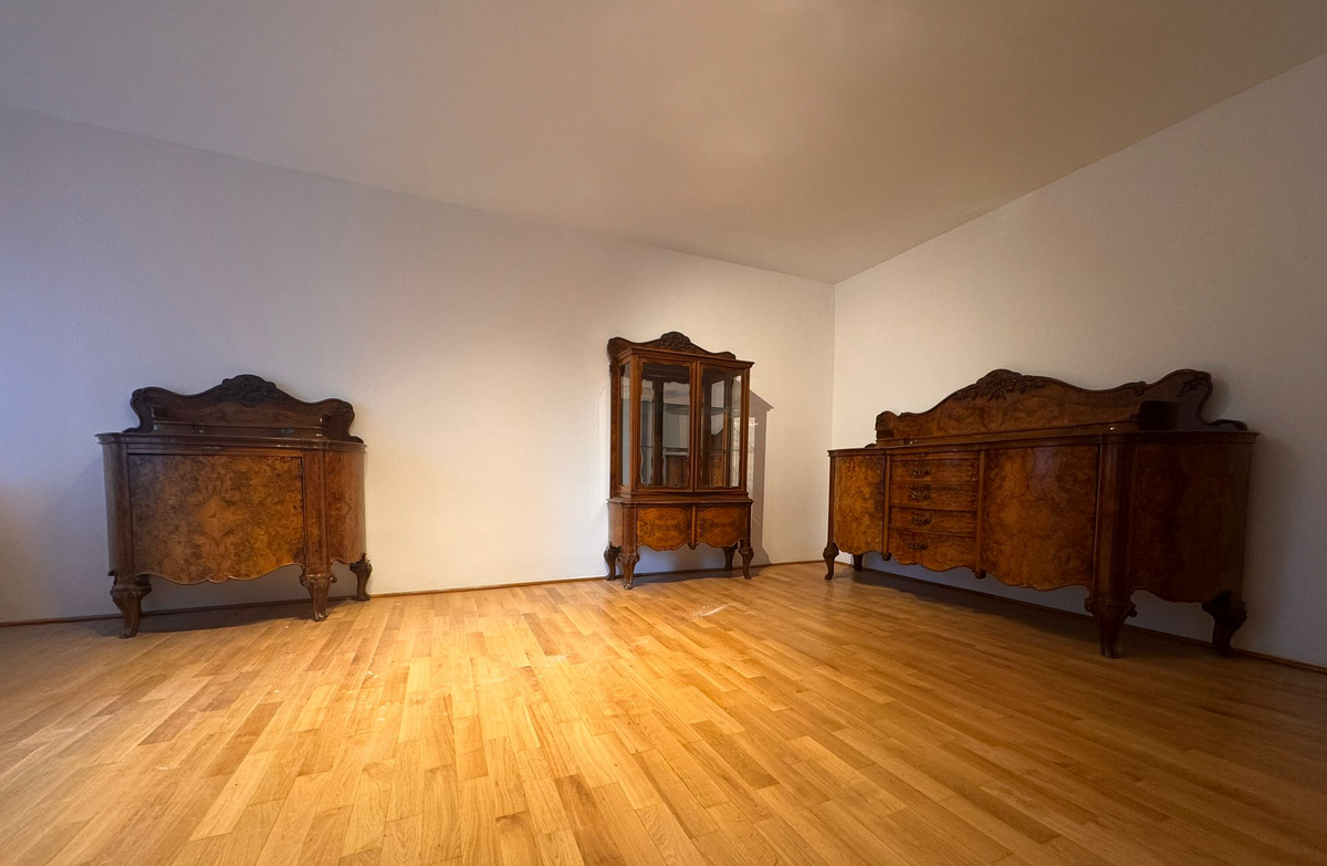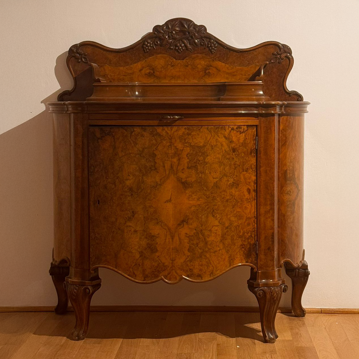 Vand set de mobilier stil Chippendale, realizat in perioada 1920–1935, cu furnir de nuc si decor floral viticol. Piesele sunt intr-o stare buna, cu componente originale.