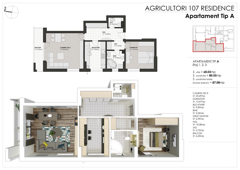 etajul 3 – garsoniera de Tip A si doua apartamente (Tip A si Tip B)