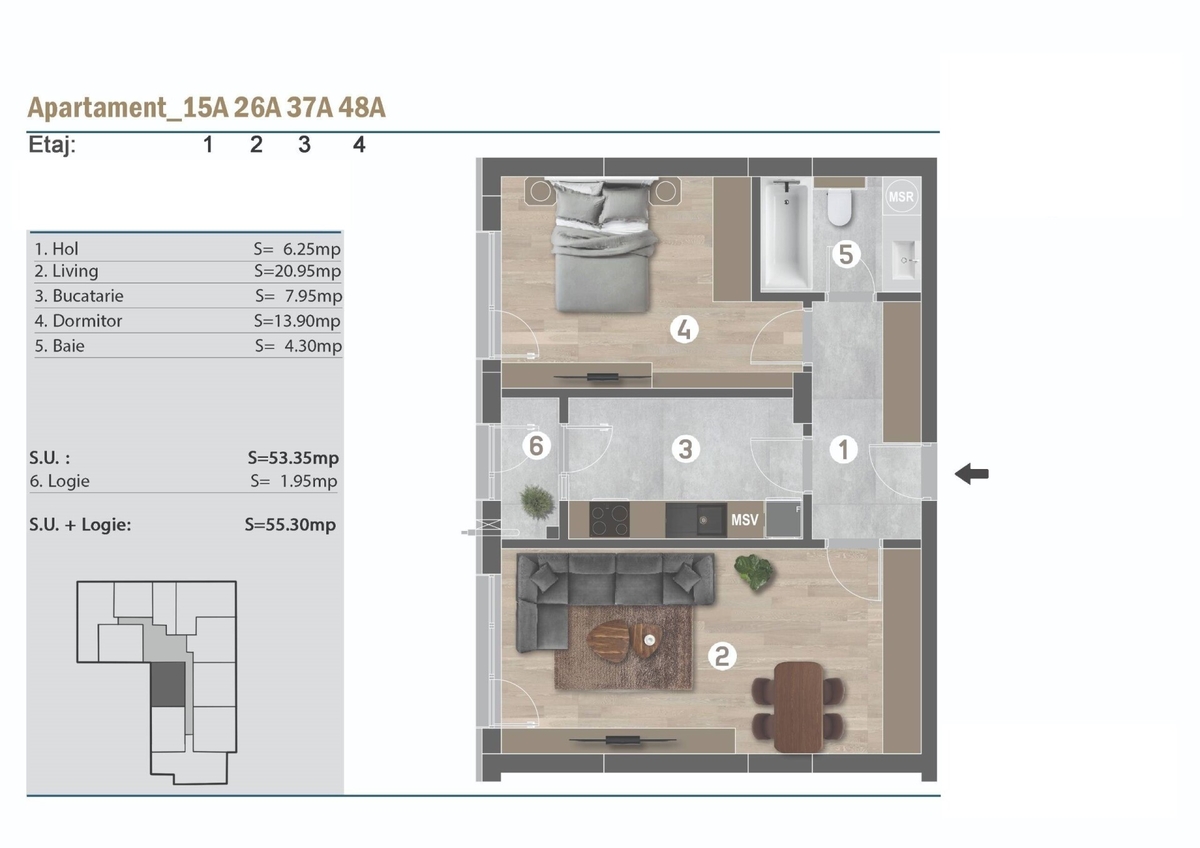 Premier Imobiliare va ofera spre vanzare un apartament de 2 camere decomandat, situat la etajul 4 din 7 nivele, cu o suprafata totala utila de 55,30 mp la pretul promotional de 71.500 euro plus TVA.