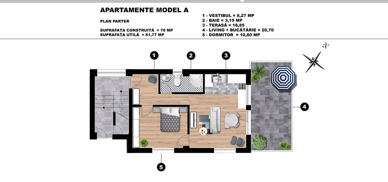 Avand o arhitectura moderna si finisaje de calitate superioara, apartamentele sunt compuse dintr-un numar de 2 si 3 camere, cu suprafete utile intre 62 mp si 129 mp, fiecare avand delimitarea perfecta intre zona de zi si cea de noapte. Terasele generoase pot gazdui cine romantice si rafinate, sau petreceri memorabile alaturi de prietenii tai.