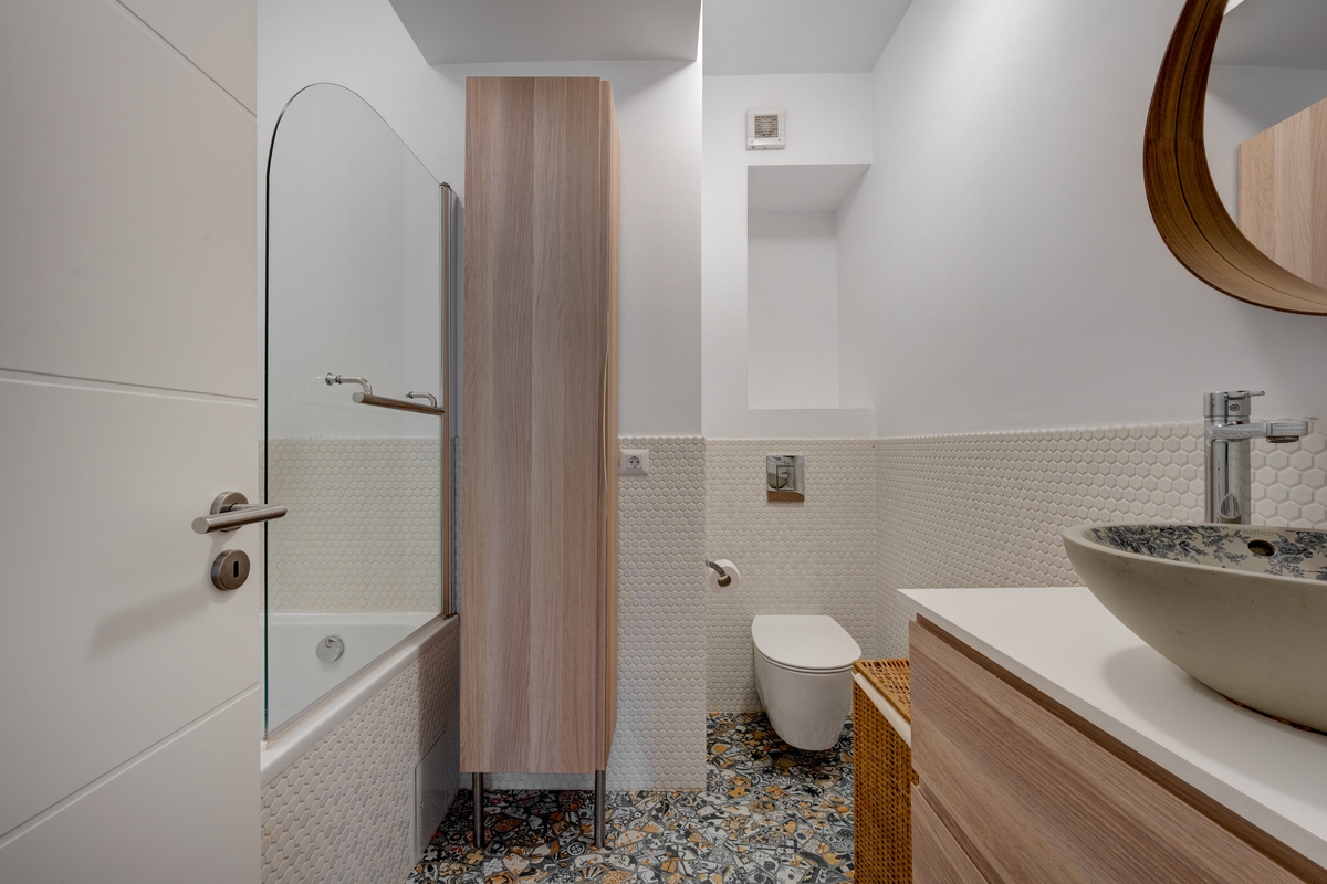 Dormitorul este linistit si aerisit, iar baia este moderna, cu finisaje atent alese si o combinatie foarte placuta de texturi.