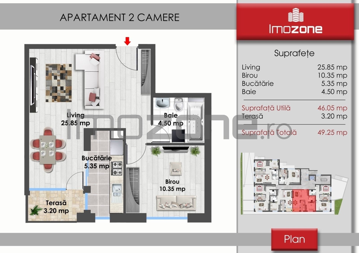 Va prezint un apartament de doua camere, decomandat cu suprafata de 49 mp, cu balcon de 3.5 mp situat intr-un bloc nou de 4 etaje.