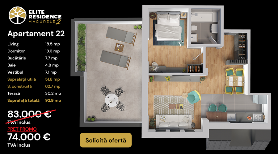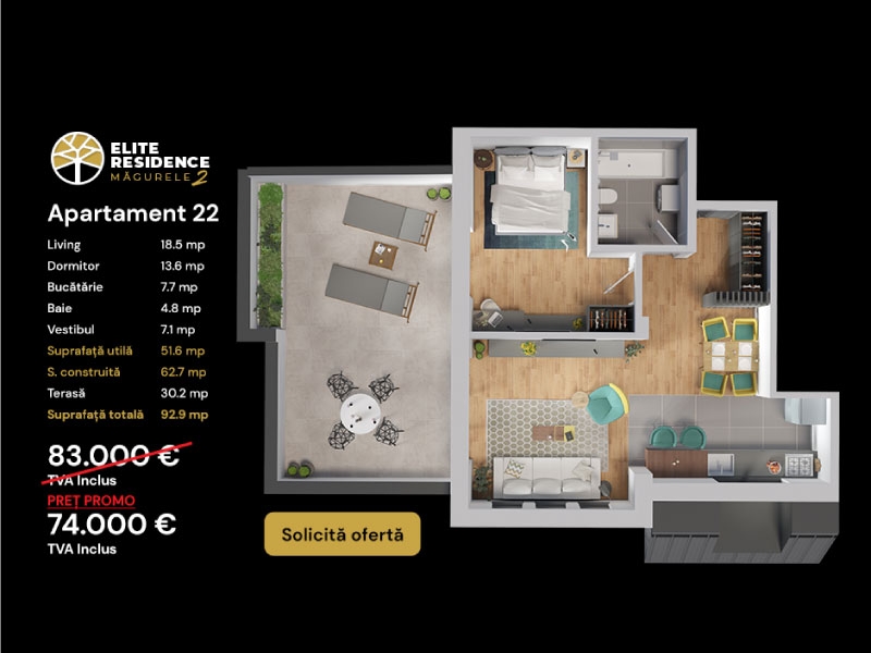- suprafata utila 51.6mp, suprafata totala 92.9mp, terasa 30mp