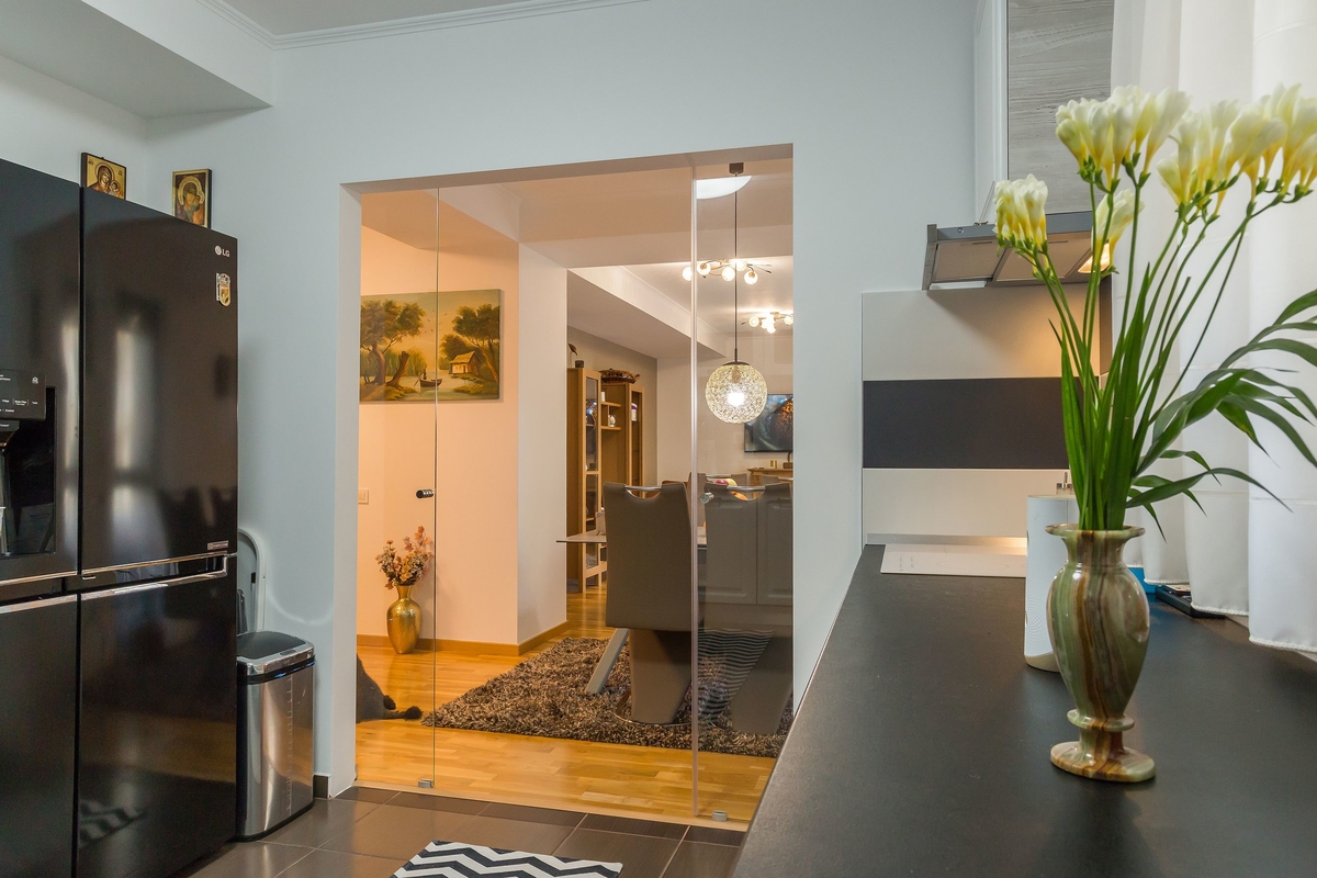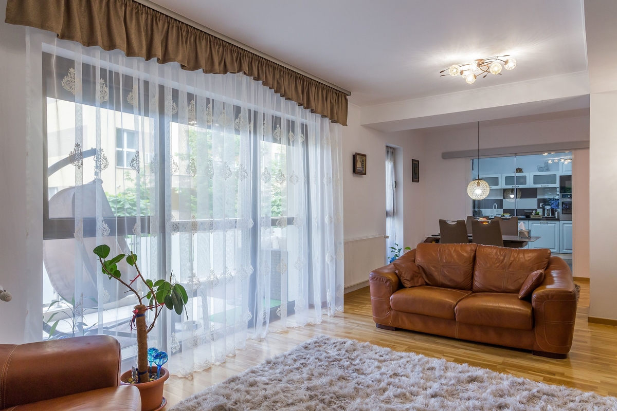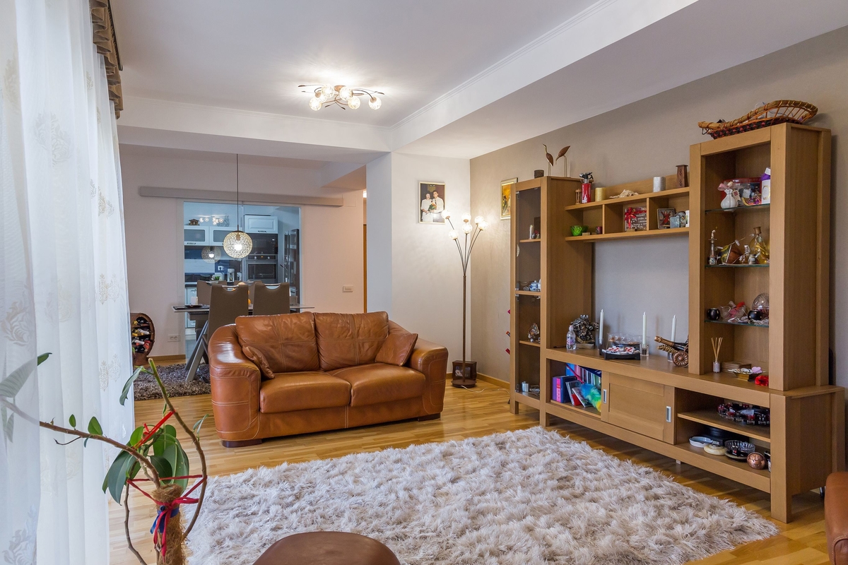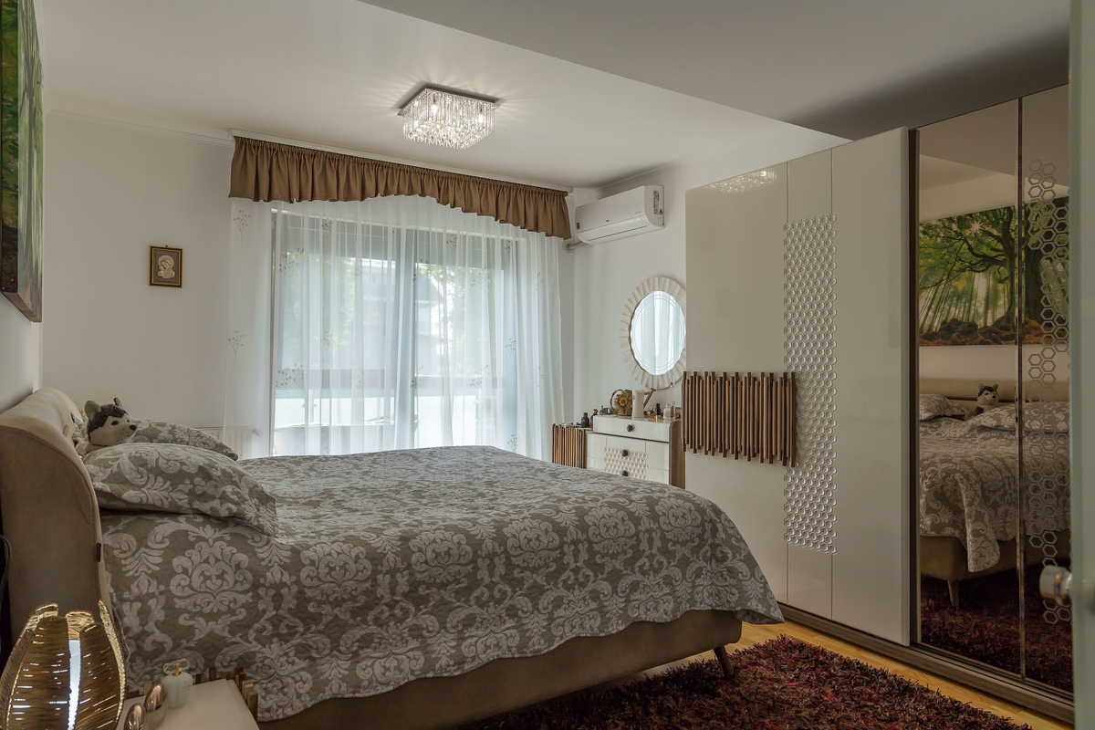 A fost amenajat cu rigurozitate si iscusinta, atat in ceea ce priveste finisajele, cat si dotarile, astfel incat va veti putea muta imediat fara nici cel mai mic efort, "doar cu geanta pe umar". Printre dotarile care va vor face viata mai confortabila, as vrea sa amintesc in mod special: rulouri exterioare actionate prin telecomanda, 2 aparate de aer conditionat LG dual inverter, usi din sticla ce separa bucataria de spatiul de servit masa si living, dar si dormitorul de holul cu dressingurile, parchet triplu stratificat.