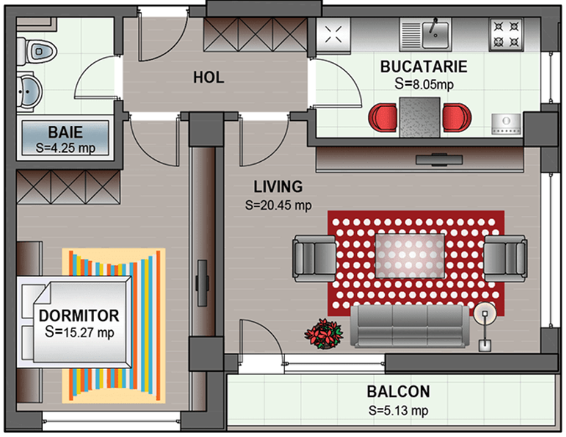Apartament 2 camere, perfect decomandat, in suprafata de 58 mp utili cu bucatarie inchisa ce are si loc de luat masa.