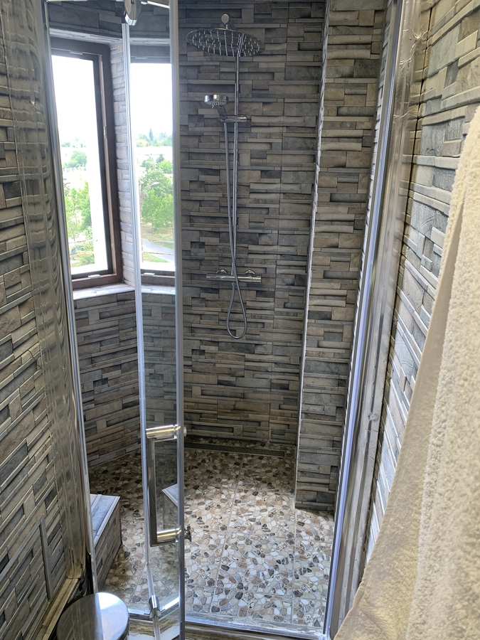 Are geam mare la baie si 3 balcoane franceze de mici dimensiuni.