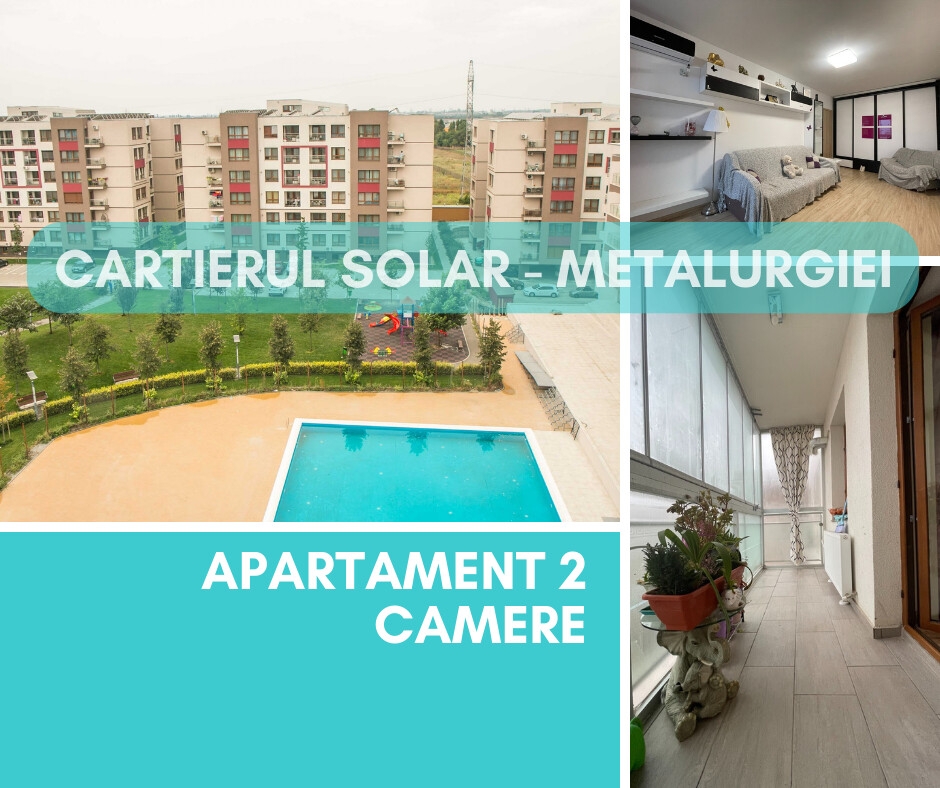 Apartamentul este situat in Cartierul Solar, Bulevardul Metalurgiei 132. Complexul dispune de piscina, parc, supermarket Carrefour , restaurant Aqua Lounge, farmacie, salon frizerie , paza BGS.