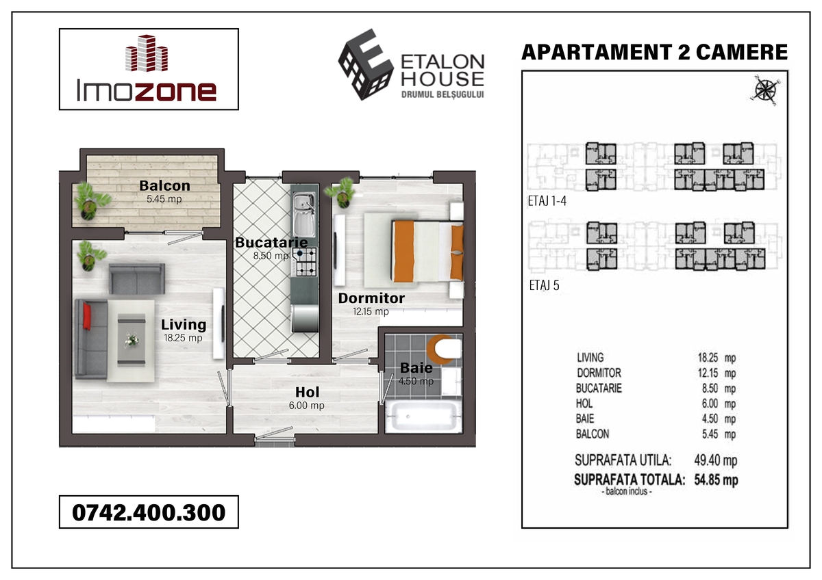 2 camere, etaj 2 din 5, lift, decomandat, 54.85 mp, se vinde finisat la cheie, finisaje de calitate la alegere in baza bugetului, centrala proprie, utilitati individuale. Pret: 62.900 euro + 5%tva