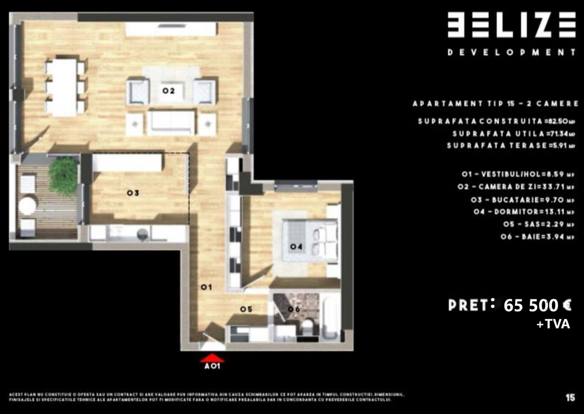 Apartamentul are 72 mp utili plus o terasa de 7 mp