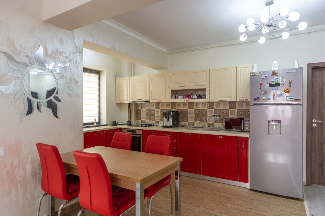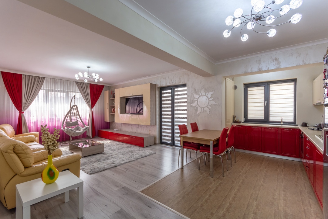 Apoi, bucataria. Pastrata deschisa, dar separata de living. Si cu posibilitate de inchidere pentru cine isi doreste. Cu mobilier complet, facut pe comanda. Cu masina de spalat rufe, cu masina de spalat vase, cuptor, plita, hota, toate incastrate. Cu inca o debara, acolo unde avem „ascunse” un raft destinat condimentelor si veselei, dar si centrala termica proprie a apartamentului. Cu combina frigorifica. Cu loc de luat masa. Ah, da, bucataria are aproape 18 mp! Da, aproape 18 mp!