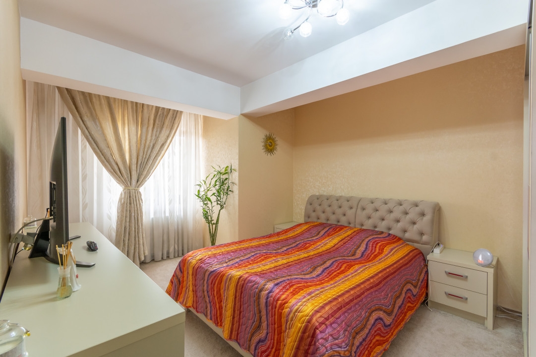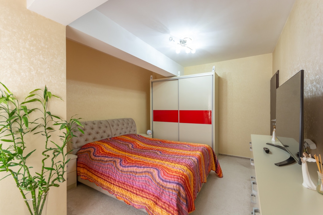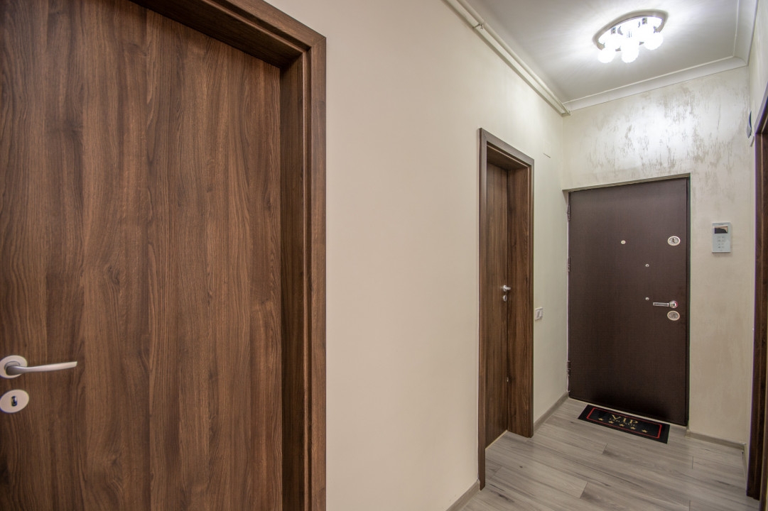 Sunt 7 apartamente pe palier. Al nostru, este cu doua camere. Are 67 mp utili. Plus o super terasa acoperita. Ferita de ploaie si vant. Avem la intrare un hol fain, ce pe o parte are dispusa baia, iar pe cealalta parte o debara. Un spatiu de depozitare, util, bine gandit, bine pozitionat. Ceva ce nu prea vezi la locuintele noi. Apoi, avem dormitorul, de „doar” 16 mp. Pat dublu, de mijloc, sifonier masiv, comoda cu televizor. Si mult spatiu de circulatie. Cu mocheta pe jos.