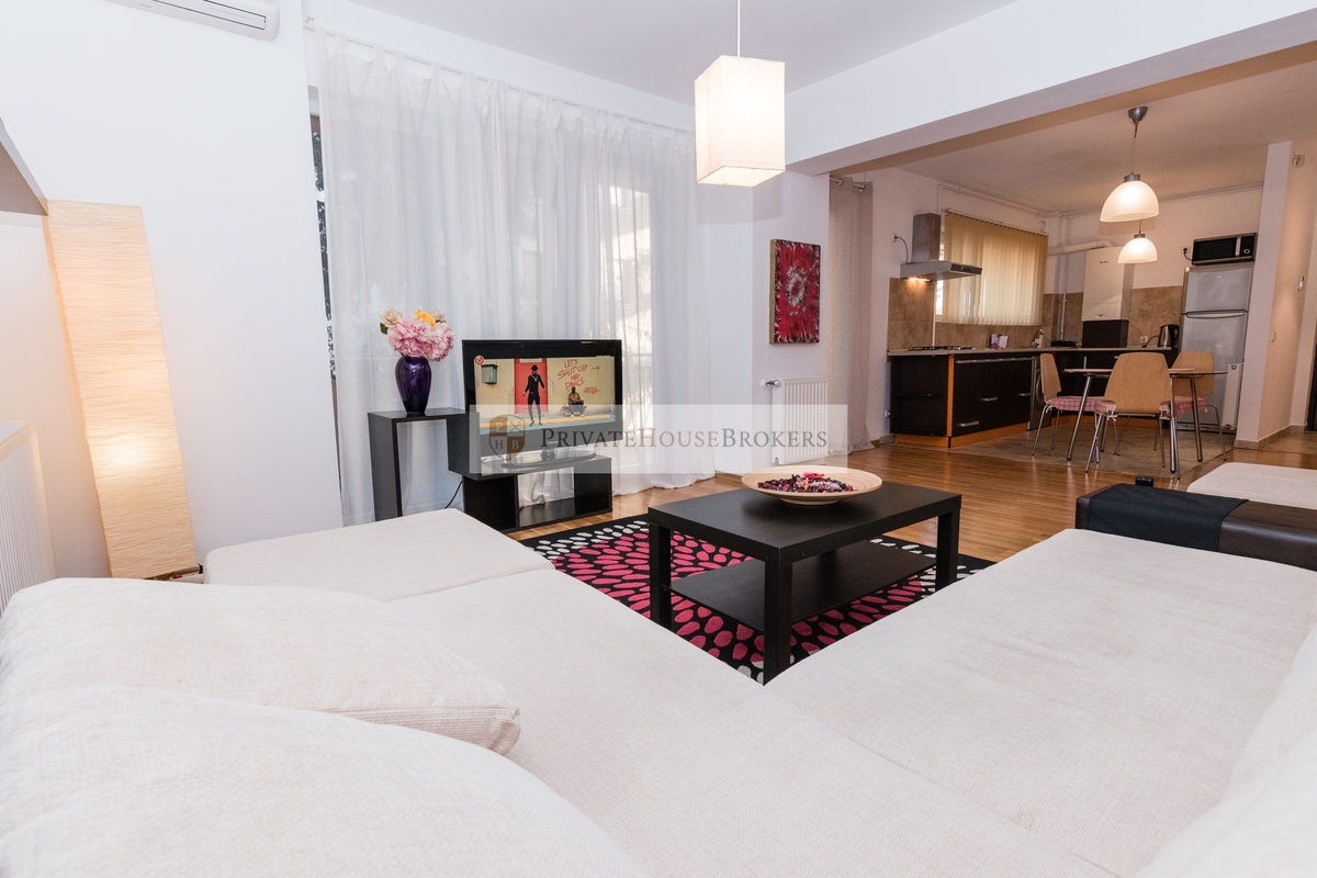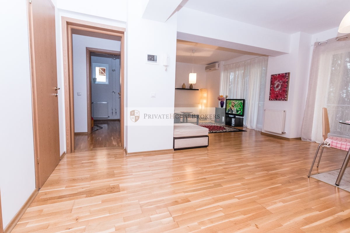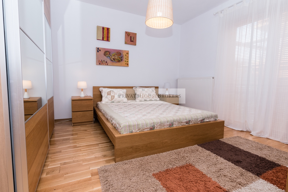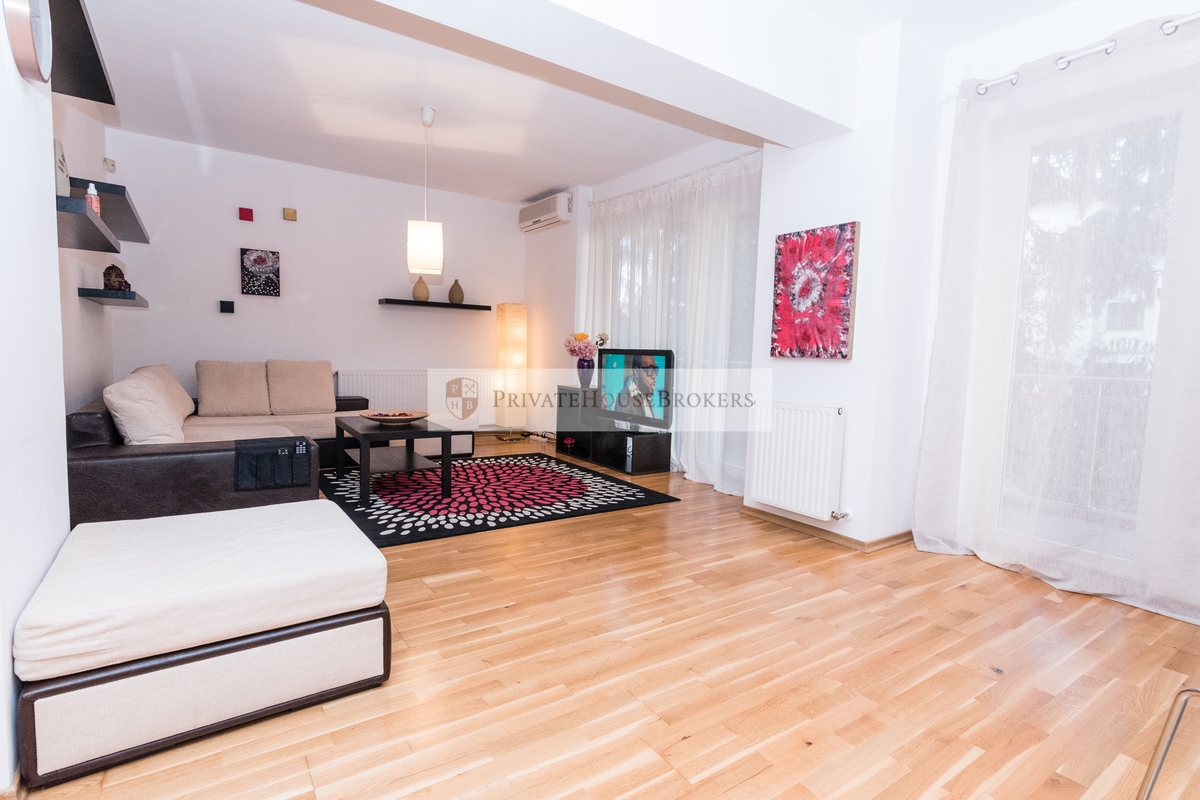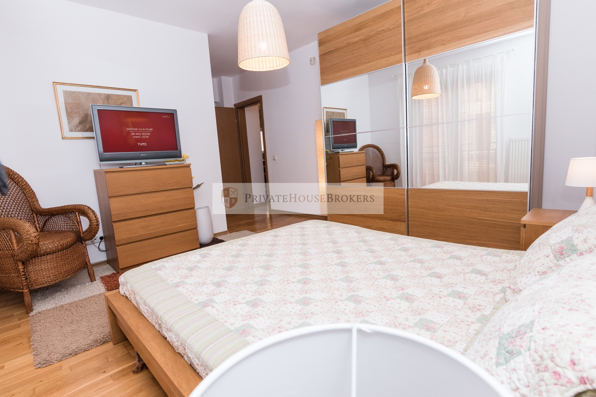 Acest apartament spatios si foarte bine compartimentat este situat la etajul 1 din 6, living si dormitor matrimonial cu dressing, debara, baie cu cada, este semidecomandat si are o suprafata de 73 mp utili interior + 9 mp terasa. Apartamentul se vinde mobilat si utilat complet modern ( exact ca in fotografii ), dispune de centrala proprie de apartament, aer conditionat, televizor, loc de suprateran acoperit.