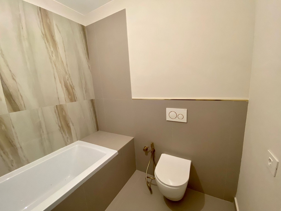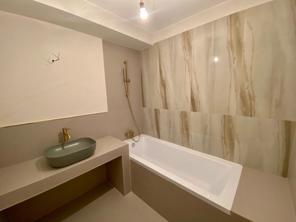 Baia si holul sunt placate cu ceramica marca Todoceram din gama Cielo e terra sabbia.