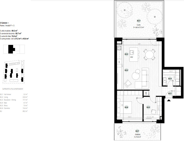 Apartament cu 2 camere+ birou, semidecomandat, la etajul P/3, intr-un complex realizat in stil scandinav, construit in anul 2023.