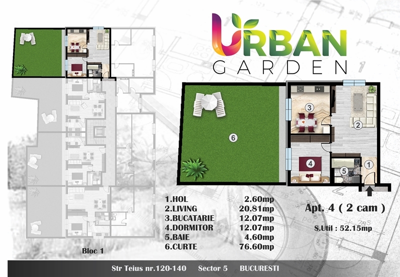 Apartamentul face parte din noul proiect URBAN GARDEN si este amplasat la doar cateva minute de Confort Urban Park Residence, in zona Teius – Floare de Colt, cu acces imediat la Soseaua Magurele, un proiect ce cuprinde 32 de vile cuplate in module de cate 8 unitati, ce dispun de gradini proprii si doua imobile tip bloc, cu regim mediu de inaltime, amplasate chiar la intrarea in ansamblu, caldiri ce dispun de functiuni mixte (rezidential si comercial), dar si de un parc destinat exclusiv acestui proiect.