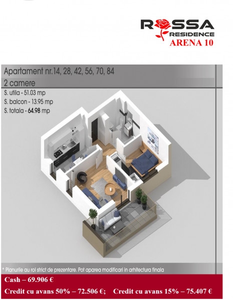Va prezentam spre vanzare un apartament cu 2 camere, decomandat, avand o suprafata utila de 51,03 mp cu terasa de 13,95 mp, disponibil la etajele 1 - 6, intr-un imobil cu regim de inaltime D+P+6E.