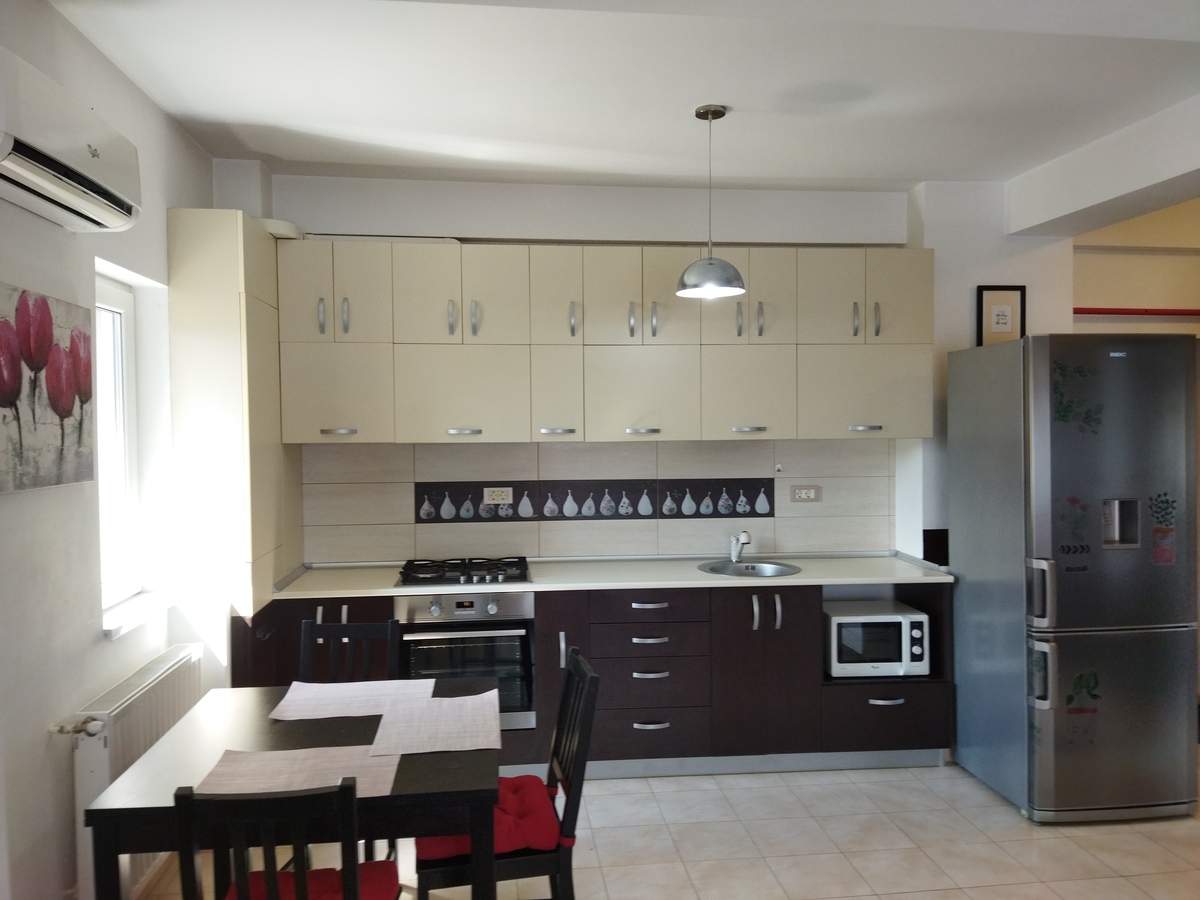 Se vinde complet mobilat si utilat asa cum se poate vedea si in poze. Dispune de centrala proprie de apartament prevazuta cu termostat, frigider No Frost Beko, aer conditionat Whirpool, plita Whirpool, cuptor electric Electrolux, hota Bosch, masina spalat Indesit, TV LG.