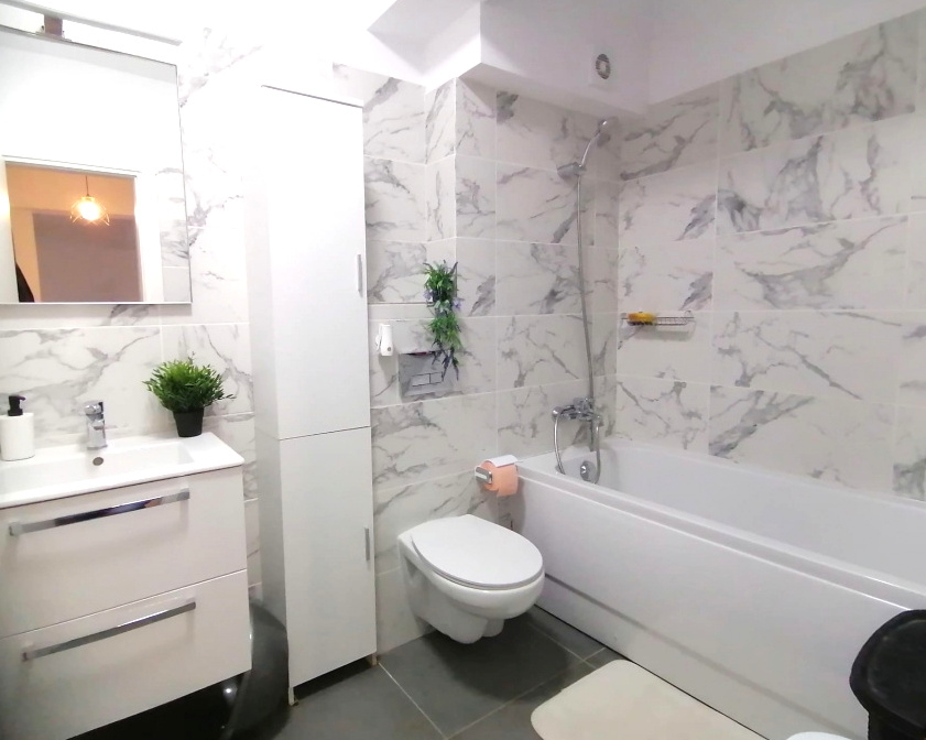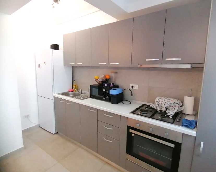 Apartamentul este compartimentat modern, avand bucataria deschisa cu livingul. Se vinde mobilat si utilat, viitorul proprietar avand nevoie numai de obiecte personale. Livingul este dotat cu canapea extensibila, o mica biblioteca, masa cu 4 locuri si aer conditionat.