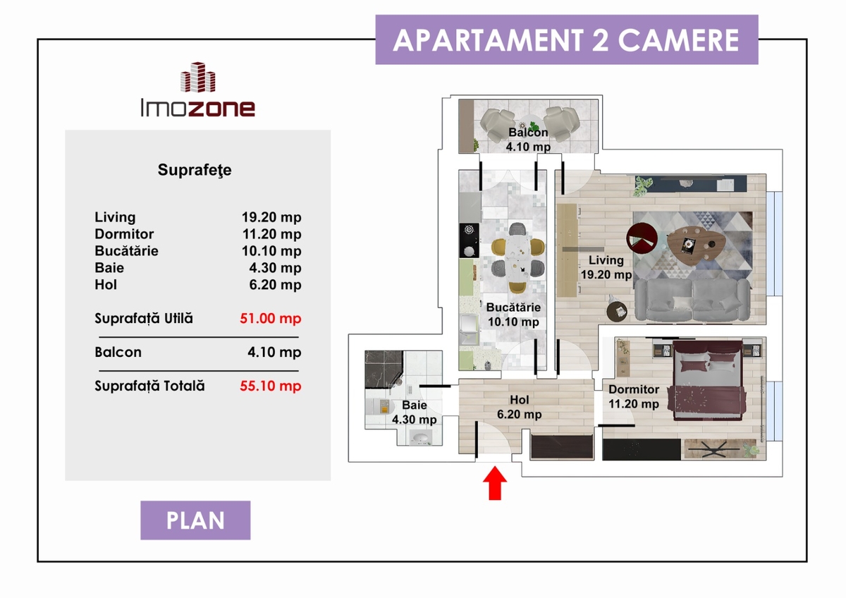 Apartament de doua camere, compartimentat eficient, cu suprafata de 55 mp, cu balcon de 4 mp, bucatarie inchisa, situat la etajul 1 intr-un bloc cu 11 nivele si cu orientarea ferestrelor catre vest.
