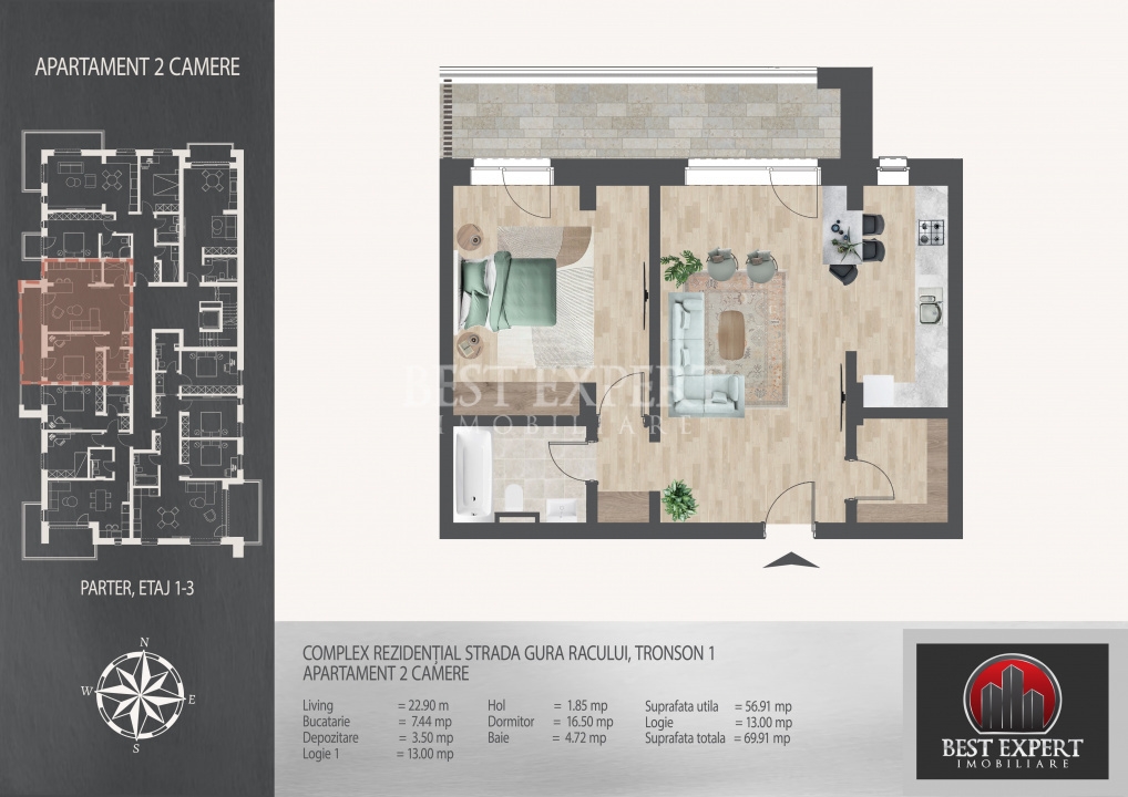 Suprafata utila - 56.91 mp utili +13 mp balcon, total 56.12 mp utili