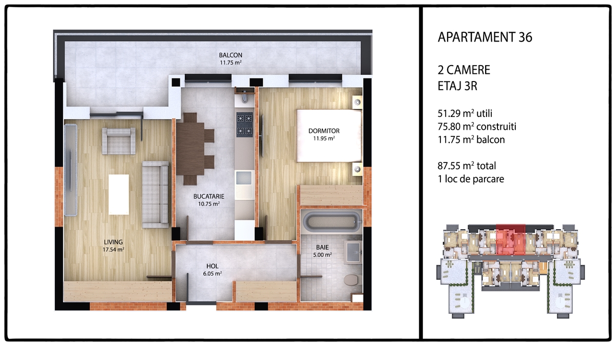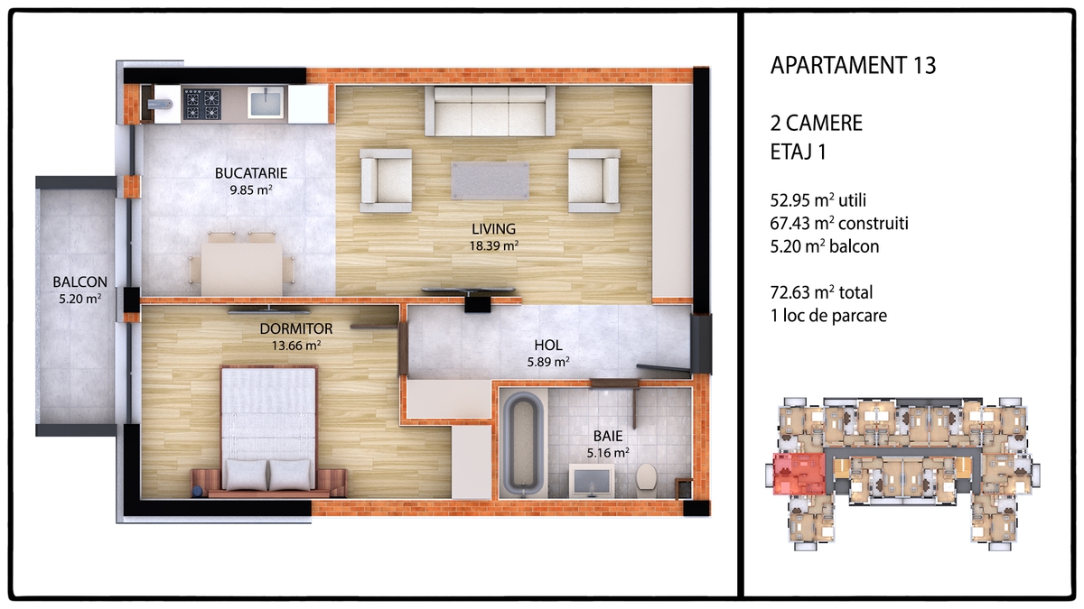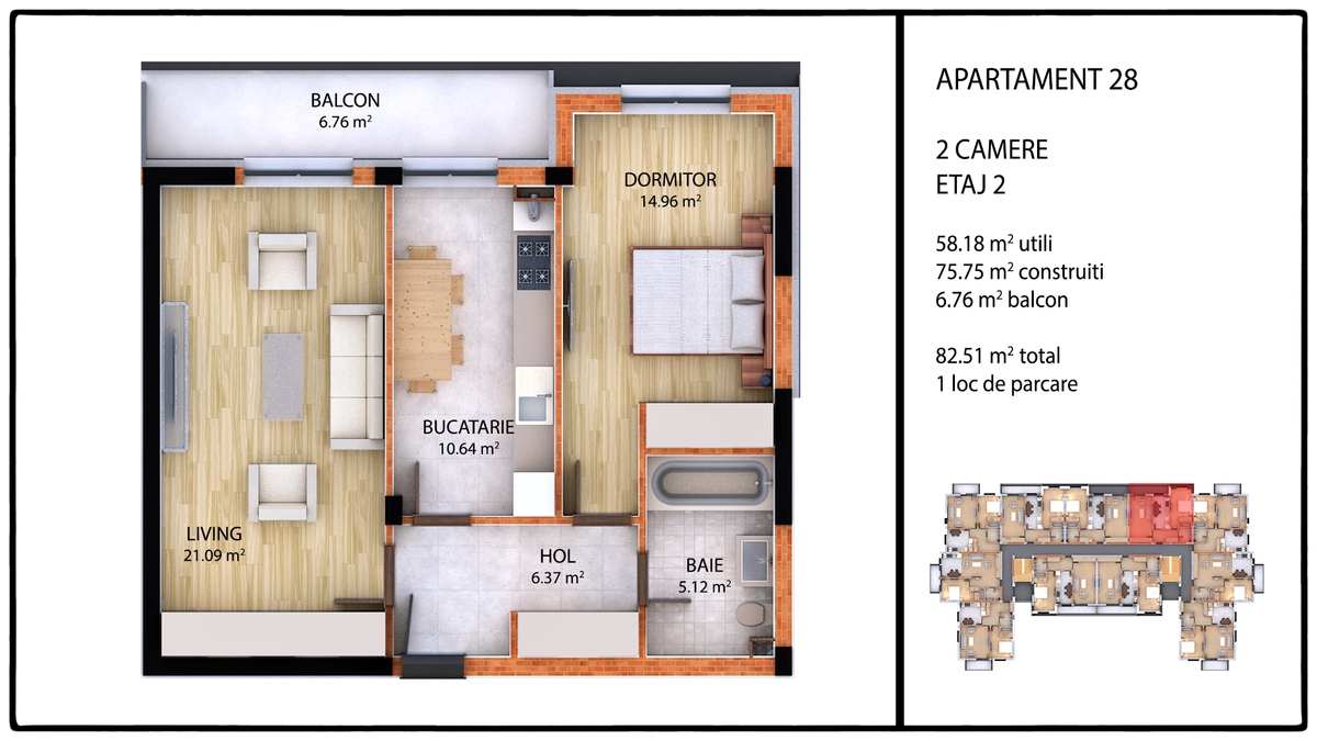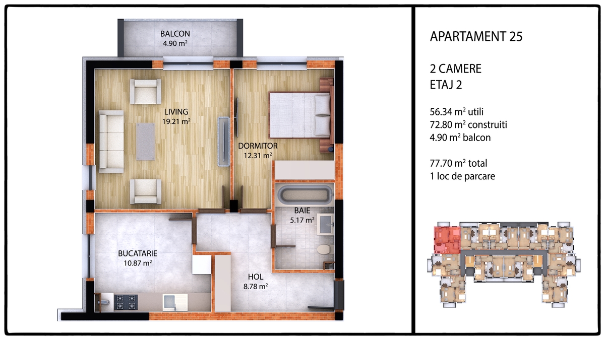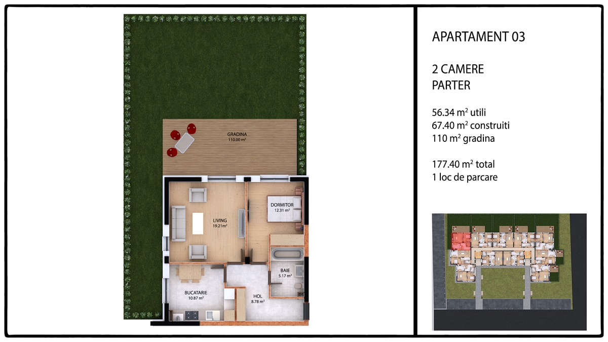 Gratuit se ofera un loc de parcare pentru fiecare apartament. Un al doilea loc de parcare se poate achizitiona pentru pretul de 2.000 euro TVA inclus!