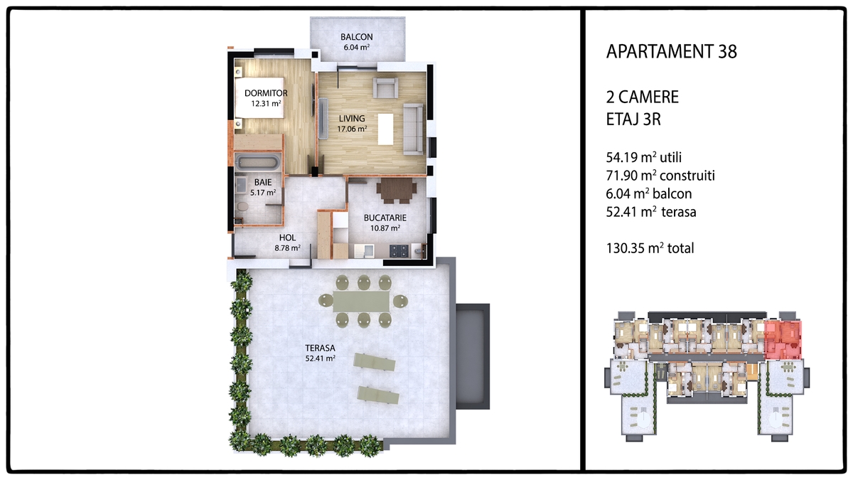 Apartamentele de la parter beneficiaza de curte individuala de pana la 110 mp, iar cele de la etajul 3 dispun de terase de 60 mp.