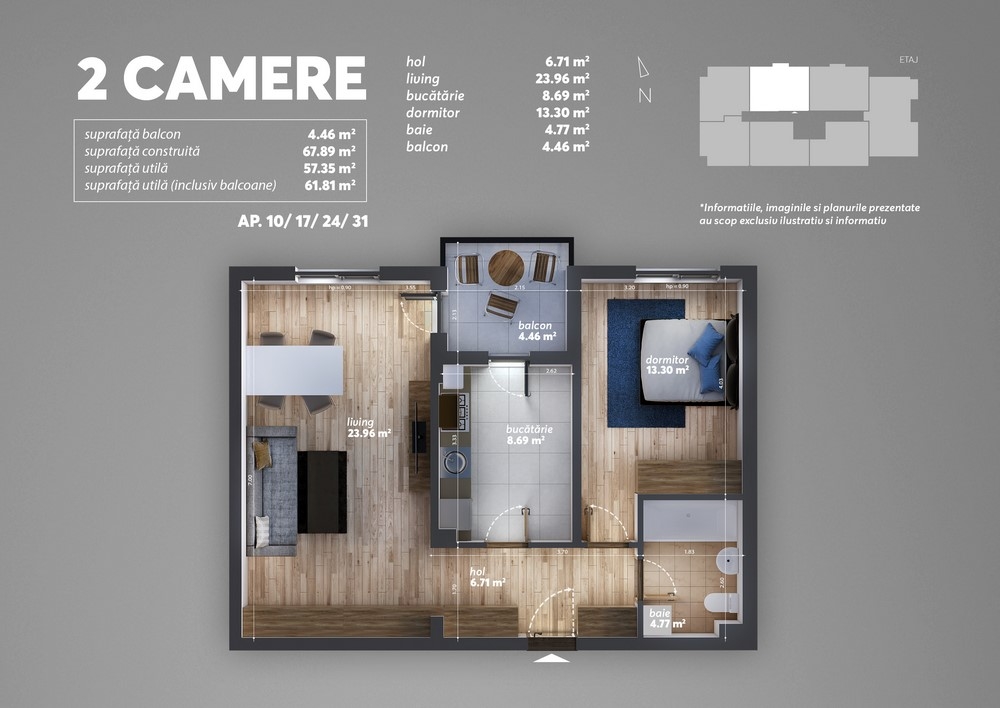 Optiuni interior: Apometre Balcon Centrala termica Contor gaze Inst. electrice noi Inst. sanitare noi Izolatie termica Termopan Usa metalica
