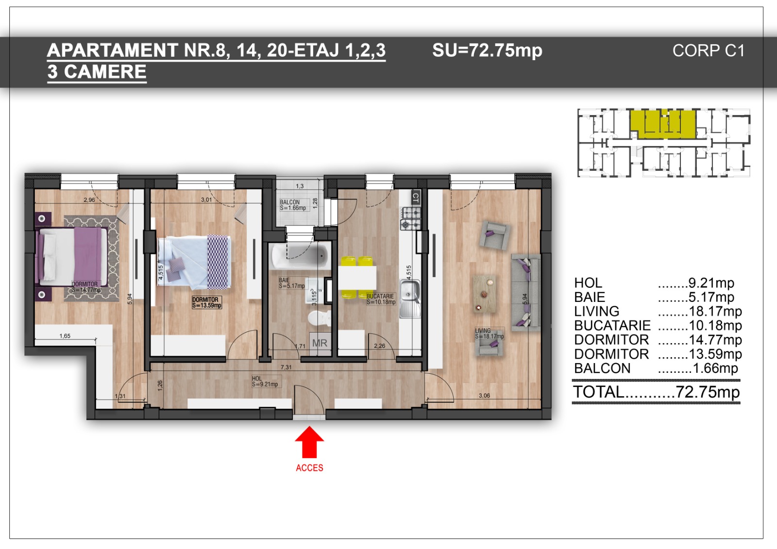 Apartamentul este format din 3 camere, are o suprafata utila 71.09mp + balcon 1.66mp si este compartimentat astfel: living, bucatarie spatioasa, doua dormitoare, o baie, hol si balcon.