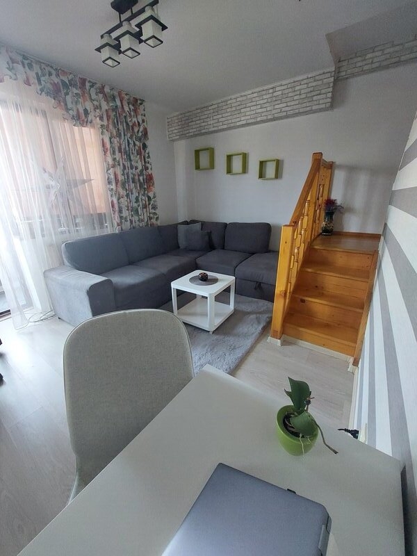 Apartamentul se afla la etajul 5 si 6 al blocului prevazut cu scara interioara, dormitoarele si baia principala fiind la mansarda.