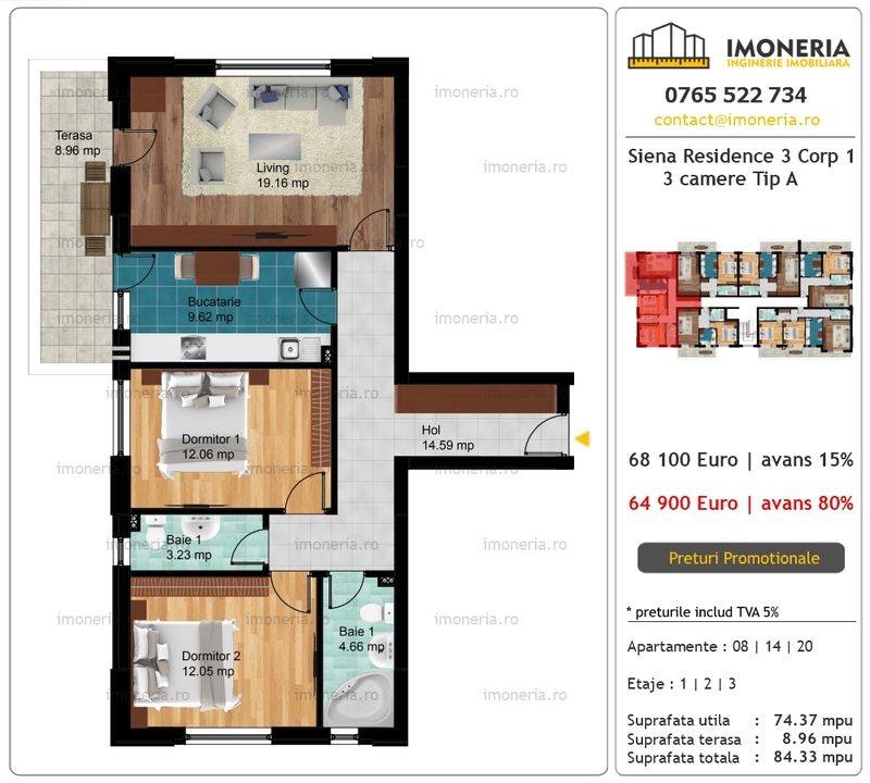 3 camere, 84.33 mpu, de la 63900 Euro, TVA inclus, pret promotional, Siena Residence 3, ansamblu rezidential in constructie, Berceni, Popesti, metrou Dimitrie Leonida.