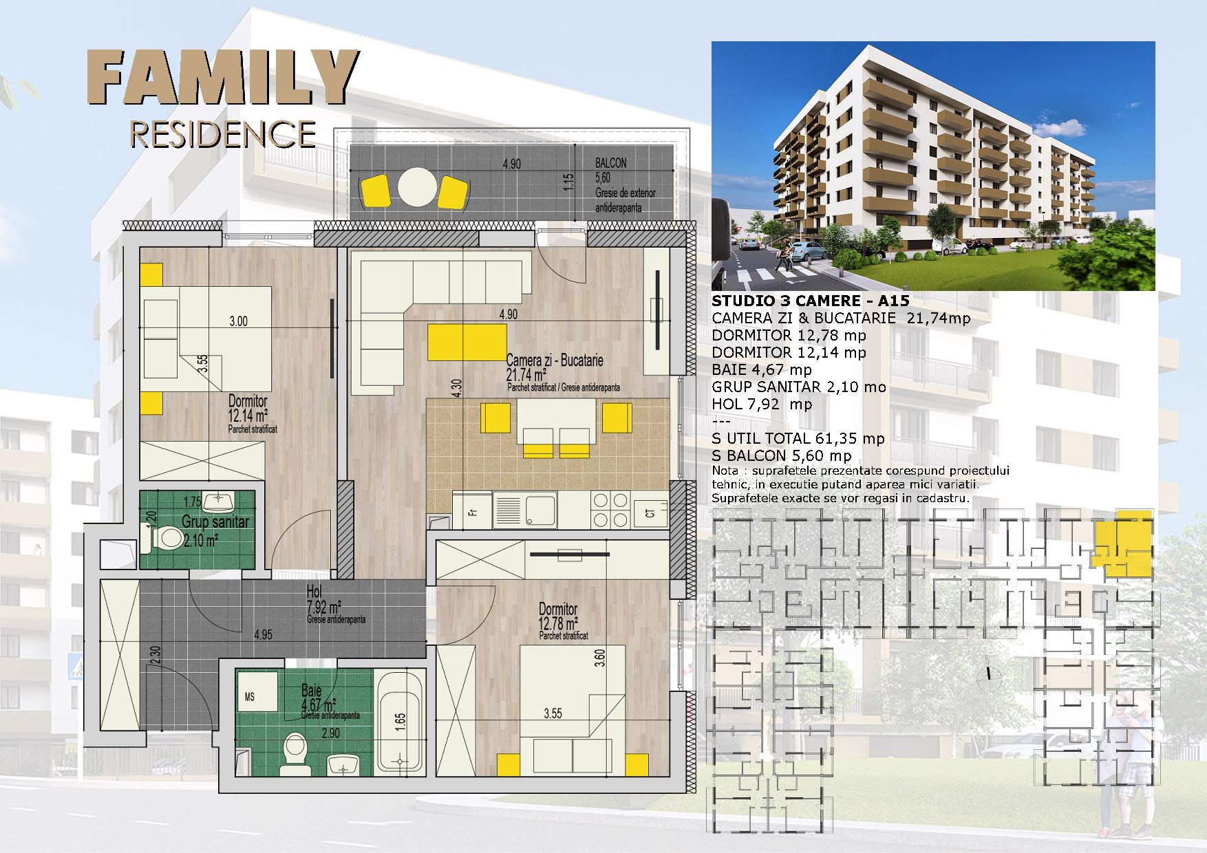 Apartamentul pe care vi-l prezentam spre vanzare este un compus din hol de decomandare, doua bai (una cu cabina de dus, iar cealalta grup sanitar), camera de zi cu iesire pe balcon, doua dormitoare, bucatarie, face parte din ansamblul Family& Afy Residence, format dintr-un numar de 2 blocuri de locuinte mixte, cu un regim de inaltime Ds+P+4+5R si un total de 156 de apartamente.