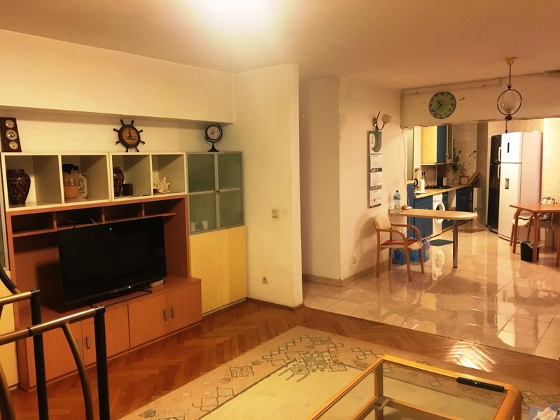 Acest apartament, decomandat, complet mobilat este situat la etajul 6 din 8 etaje ale imobilului (construit in 1993) si are o suprafata utila de 87 mp. Este impartit dupa cum urmeaza: o camera de zi spatioasa cu o bucatarie open space complet echipata, doua dormitoare, o baie complet echipate, un spatiu de depozitare si trei balcoane.