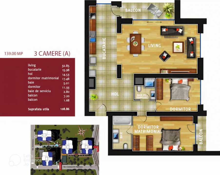 Va oferim spre vanzare un apartament cu 3 camere, tip A, cel mai spatios, de peste 110 mp utili, situat intr-unul dintre cele mai luxoase complexe rezidentiale din Bucuresti - Incity. Acesta se afla in corpul D al complexului si este amplasat in zona Dristor, pe Calea Dudesti 188, cu vedere spre laterala blocului.
